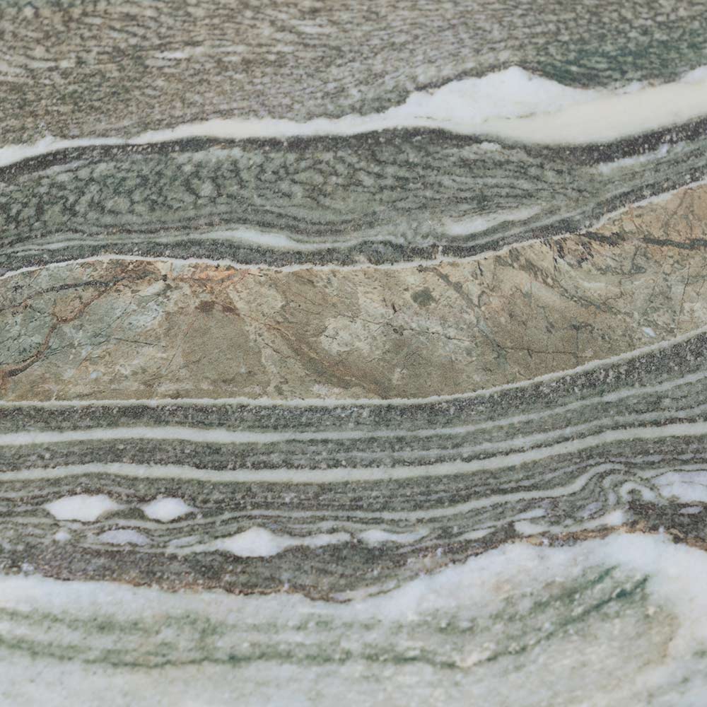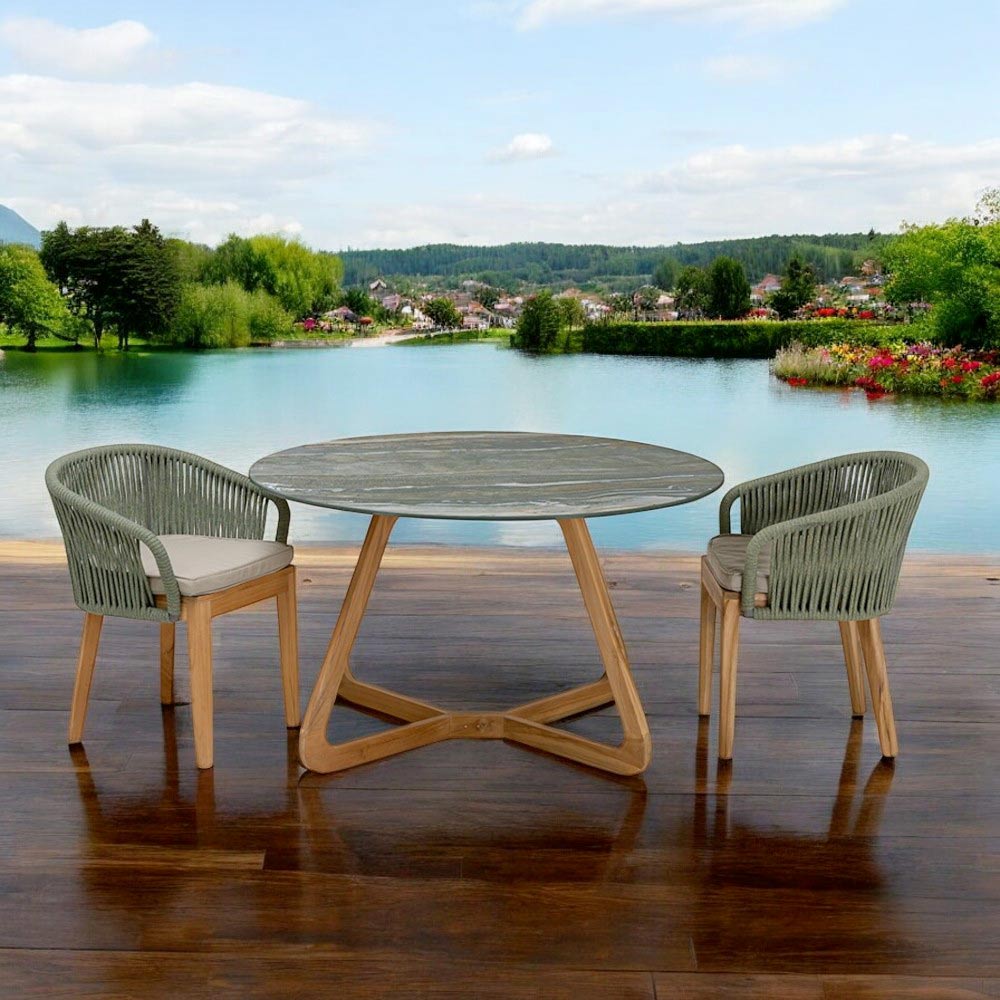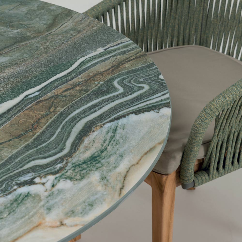 outdoor spaces. The table, with its round ceramic top, recalls the serene waves of an Alpine lake, offering not only a practical surface but also a real conversation piece. The wooden base provides