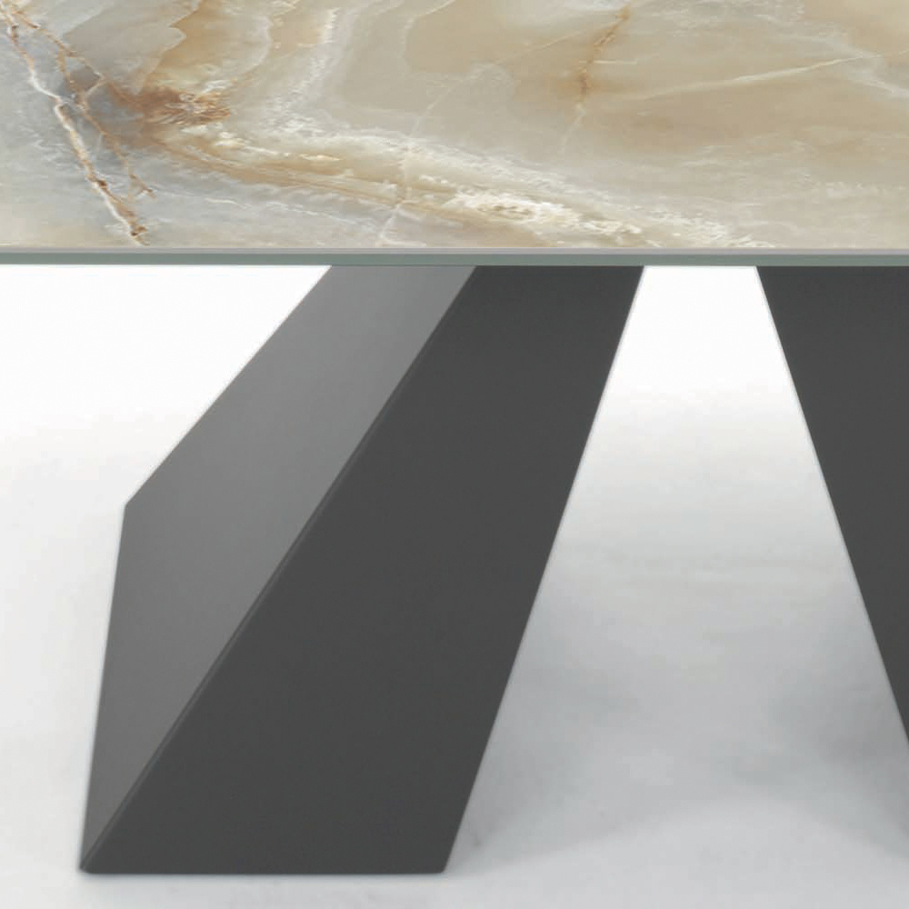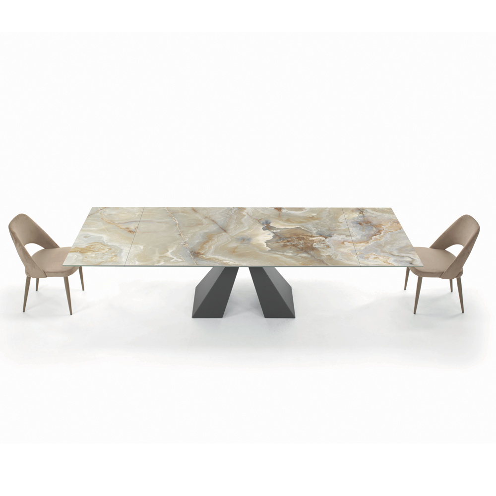 Extendable lounge table with integrated extensions, ceramic top in shiny golden onyx finish , straight edge, base in