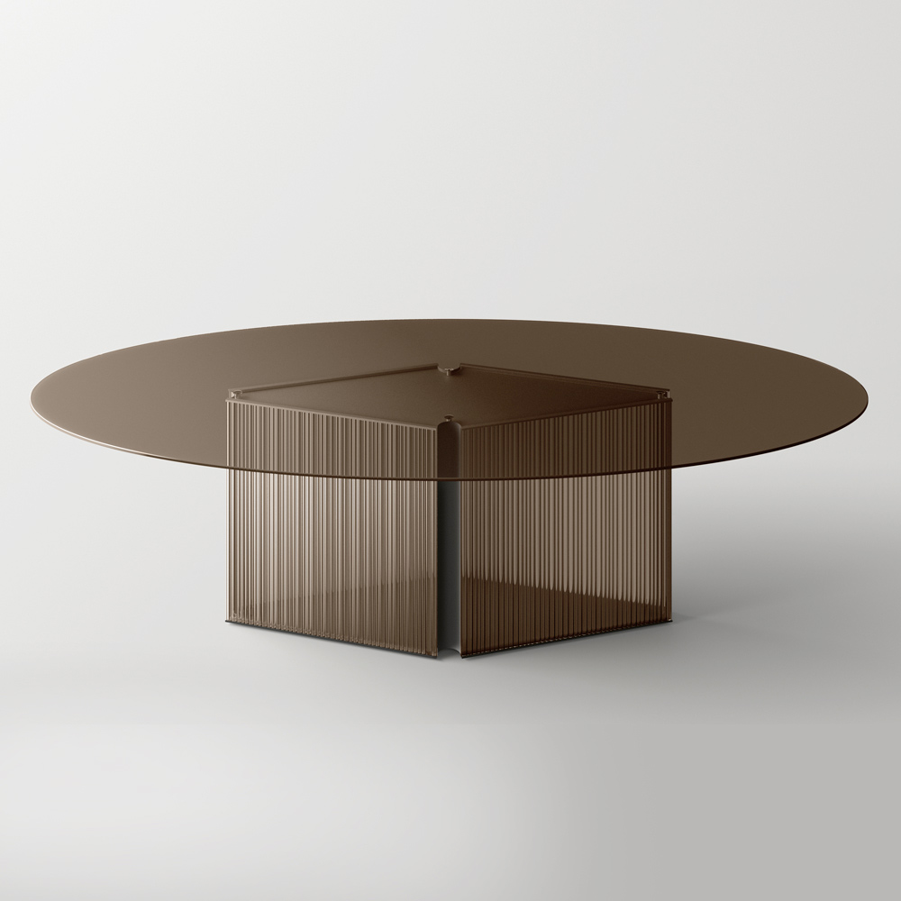 The real attraction of this table lies in its unique base, featuring thin vertical glass strips that not only support the top, but add an element of texture and visual movement . These queues, with their almost sculptural appearance, create an interesting play of light and shadow, transforming the table into a modern sculpture.