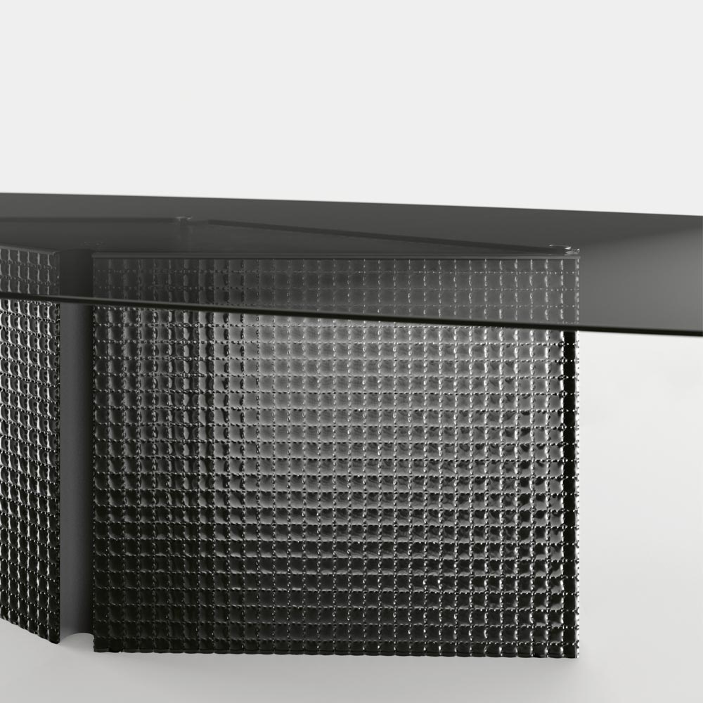shaped tempered glass top fixed to the base by steel plates and central base made up of