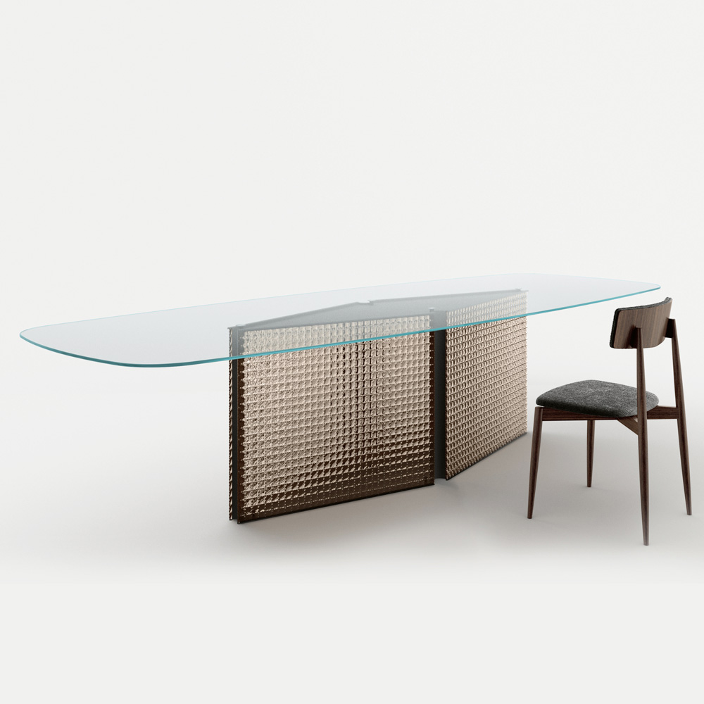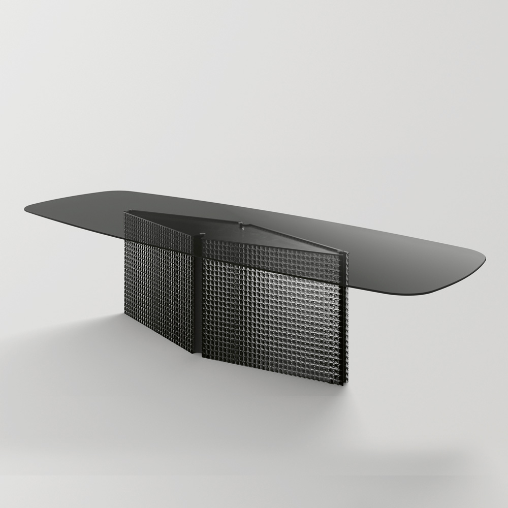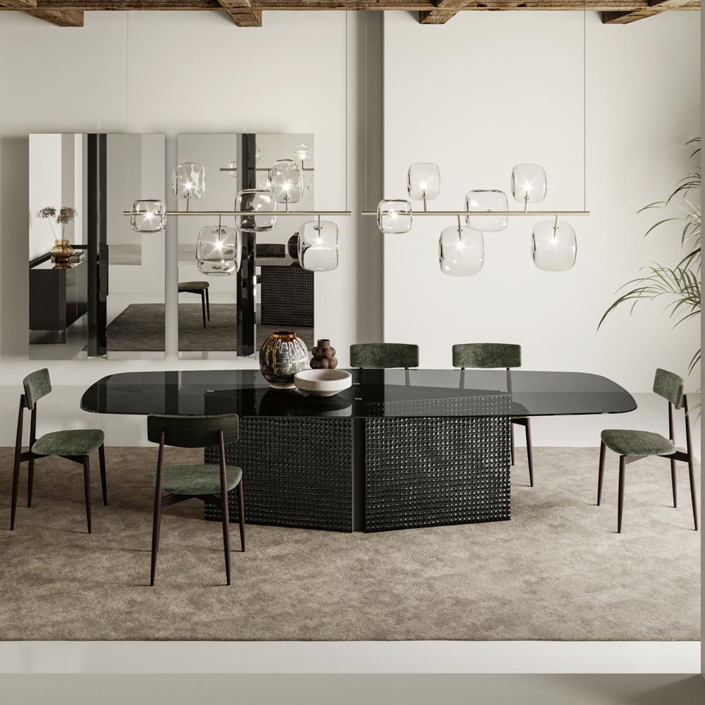 This dining table is an example of avant-garde design that blends elegance and functionality . Its slim, elongated silhouette with a glass top offers a smooth, refined surface, ideal for formal dining or as a focal point in a contemporary design space.