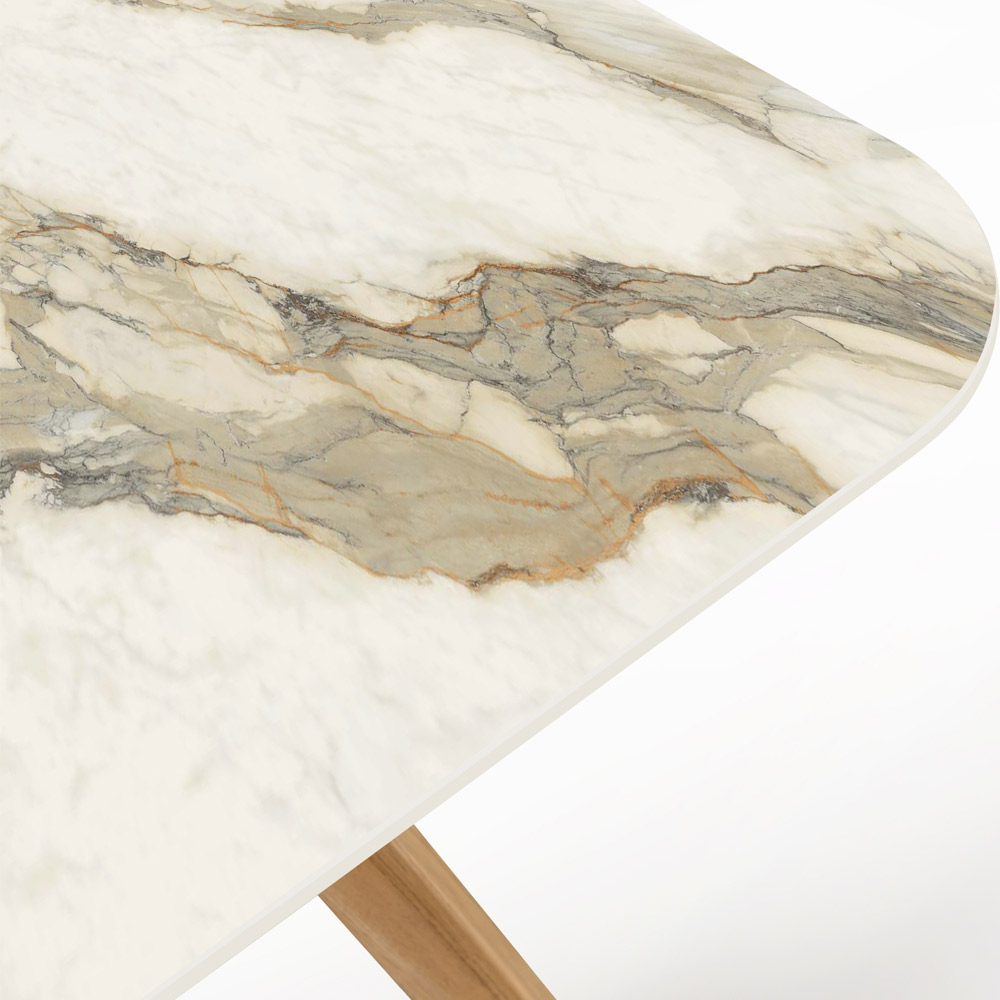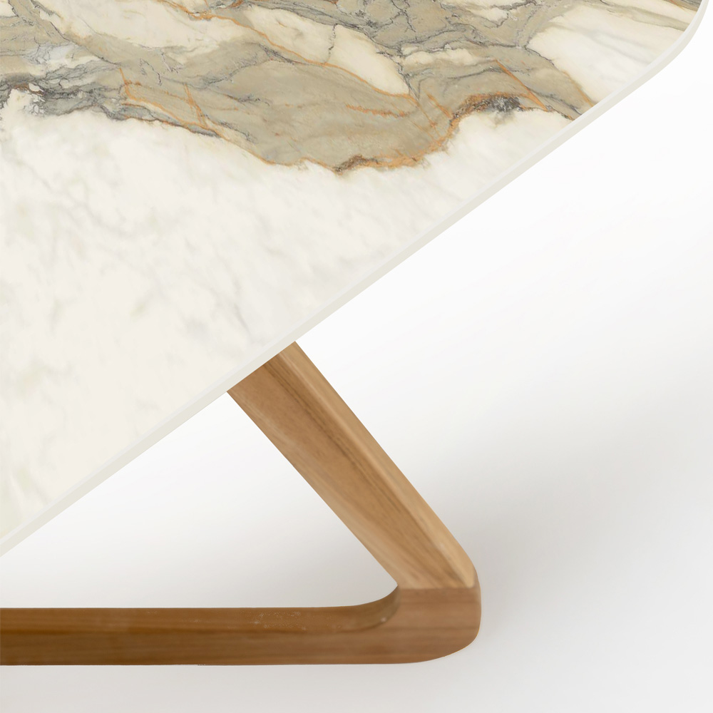 Made in Italy. This outdoor table is a masterpiece of design that blends the art of ceramic with the craftsmanship of wood. The ceramic top is inspired by the prestigious Calacatta Hermitage marble, known for its intricate grey-green veining against a creamy white background, adding a touch of luxury and sophistication to any outdoor space.