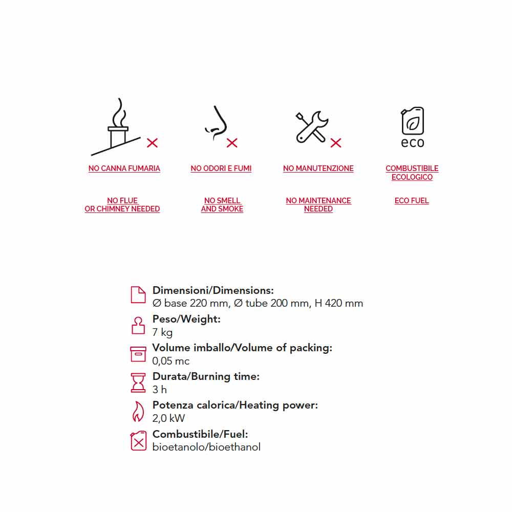 Griff 8 stainless steel bioethanol burner , with a heating power of 2,0 Kw.