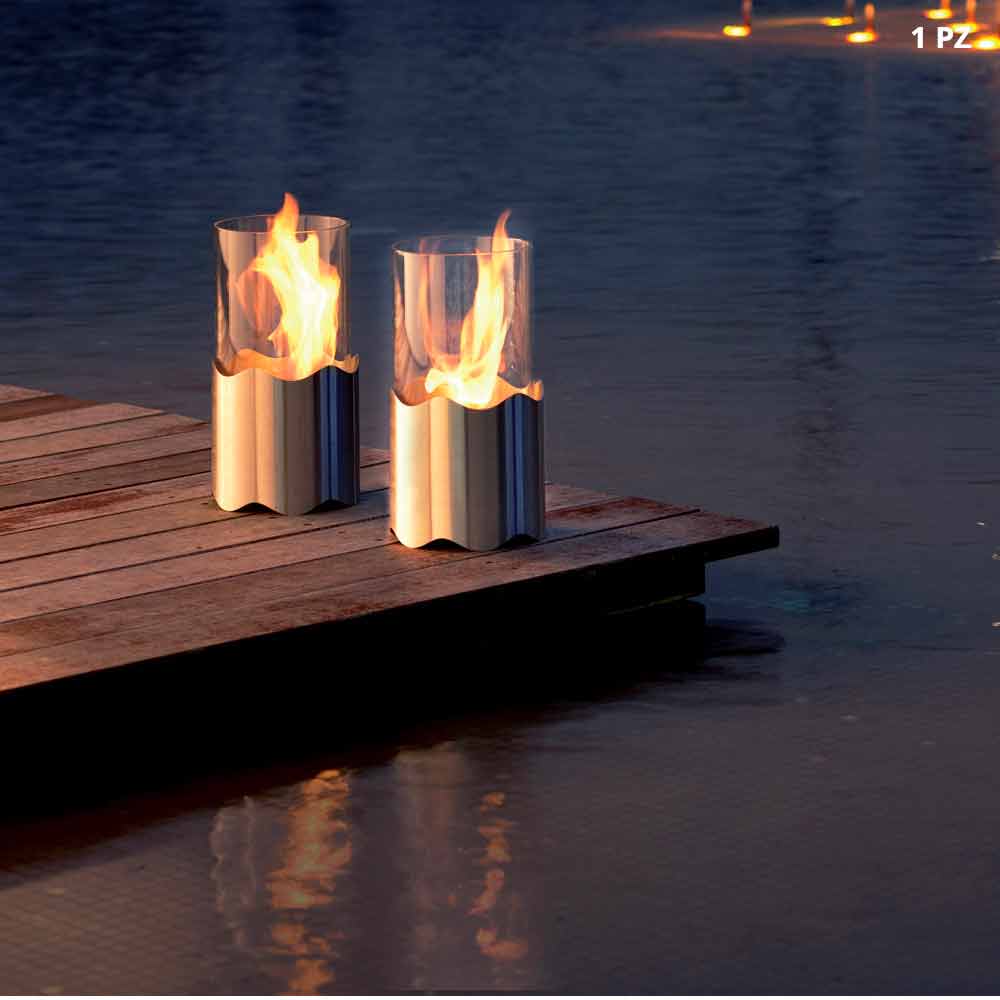 Inspired by the relaxed floating movement of the waters of a lake, it combines aesthetic lightness, the heat of the flame, and the inherent strenght of pure steel.
