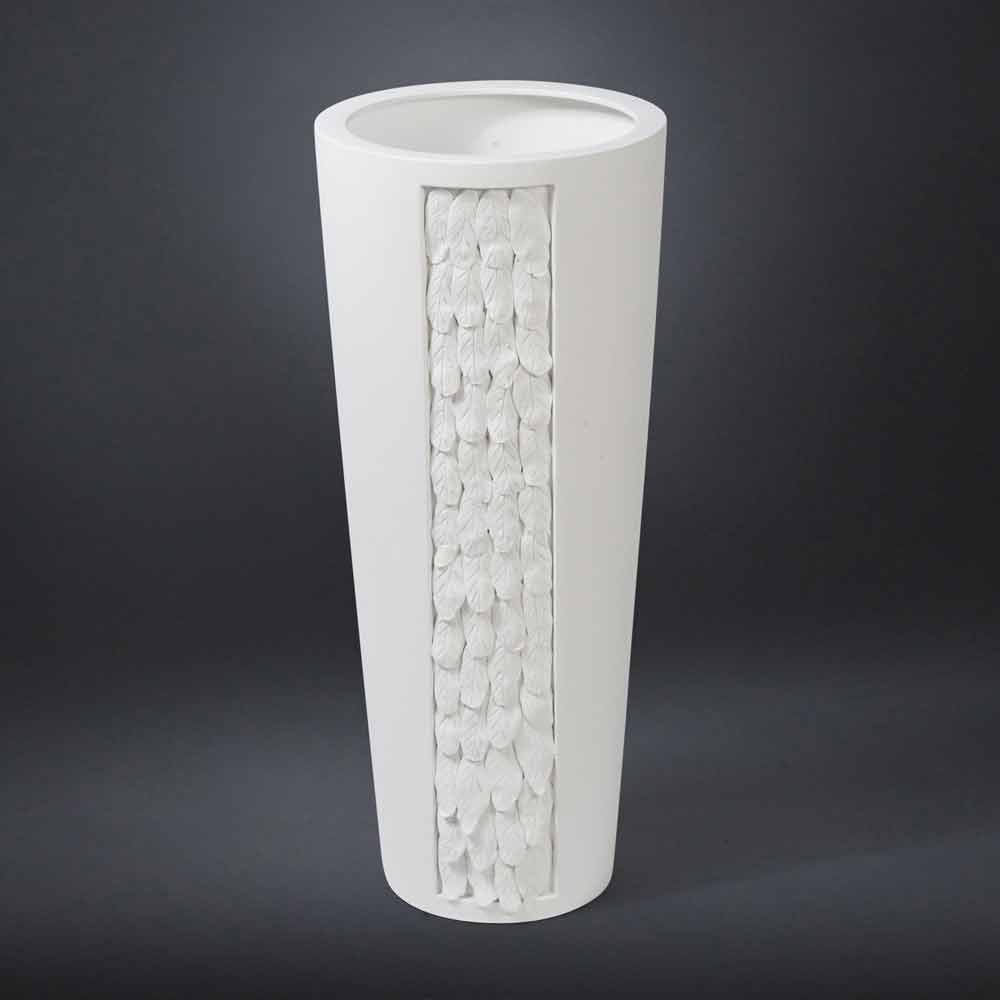 Tall vase for interiors made in Italy in opaque white ceramic through an artisanal process . An aesthetic punctuated by essential shapes enriched by an elegant detail with a leaf texture that covers part of the structure of the vase. This detail together with the refined finish chosen give this complement all its personality making it a perfect solution for spaces characterized by a classy style . The use of ceramics and craftsmanship make it an exclusive and refined decorative element, increasing its value and emphasizing its quality. An ideal aesthetic for the most varied environments, from home furnishings to that of hotels, restaurants, contract areas, spas but also as a setting for events and weddings.