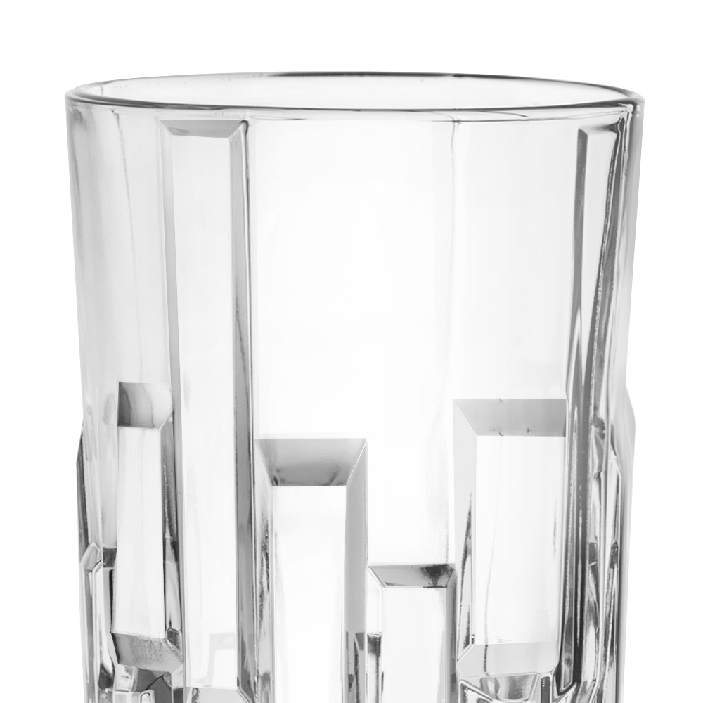 This highball glass service for drinks or cocktails is characterized by its geometric decorations inspired by the energy of the eruption of a volcano.