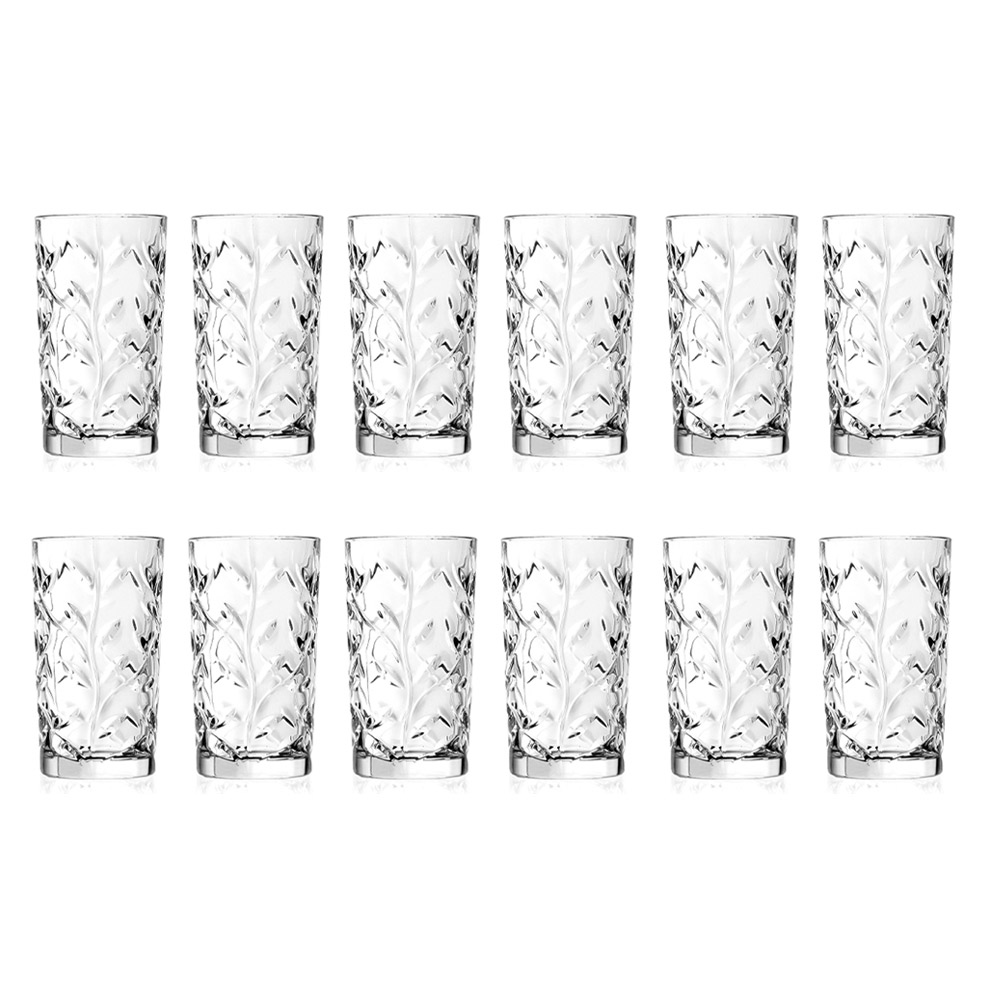 Tall tumbler glasses in eco crystal with leaf decoration, 12 pieces made in Italy.