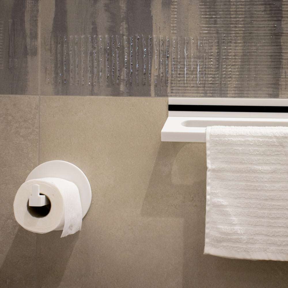 Choose this 6 mm thick toilet roll holder with white front pin and wall protector disc as a bathroom accessory for a modern and luxurious atmosphere entirely made of Corian, a hygienic material with essential queues.