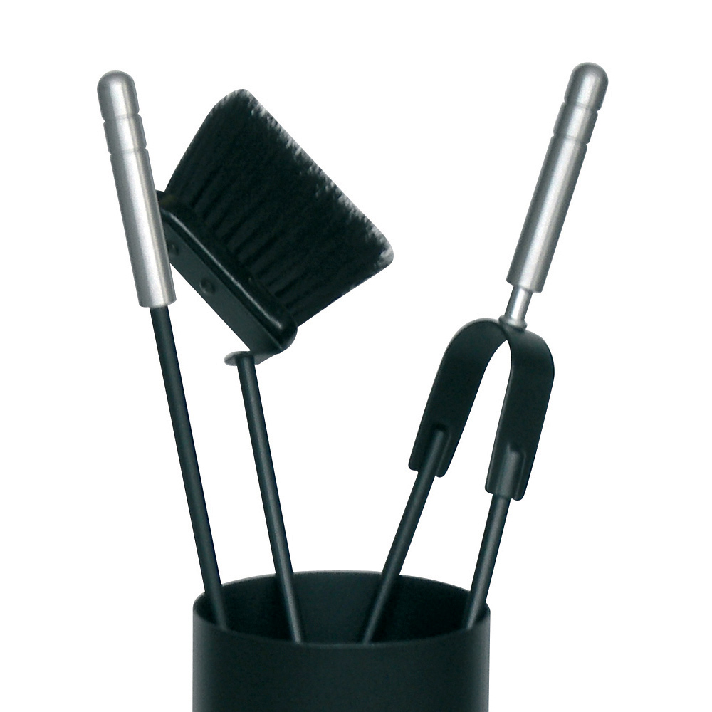 Tool holder made of black metal , entirely Made in Italy. The tool holder includes 3 essential fireplace care accessories : a clamp, a dustpan and a brush .
