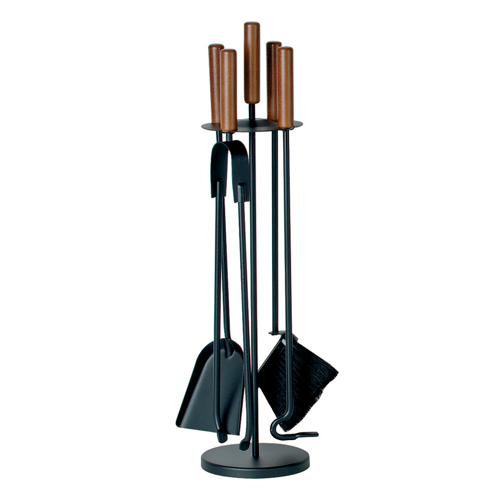 This set of fireplace tools combines the elegance of classic design with the essential functionality for caring for the home. The black metal structure, supported by a solid circular base, is designed for stability and durability. Wooden accents on the tool handles add a touch of natural warmth, contrasting nicely with the matte metal finish and giving the set a cosy, refined look.