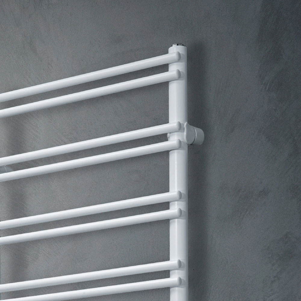 Electric towel warmer in carbon steel with traffic white finish with horizontal elements and vertical collectors entirely made in Italy with wall fixing kit included . Electrification kit positioned at the bottom right.