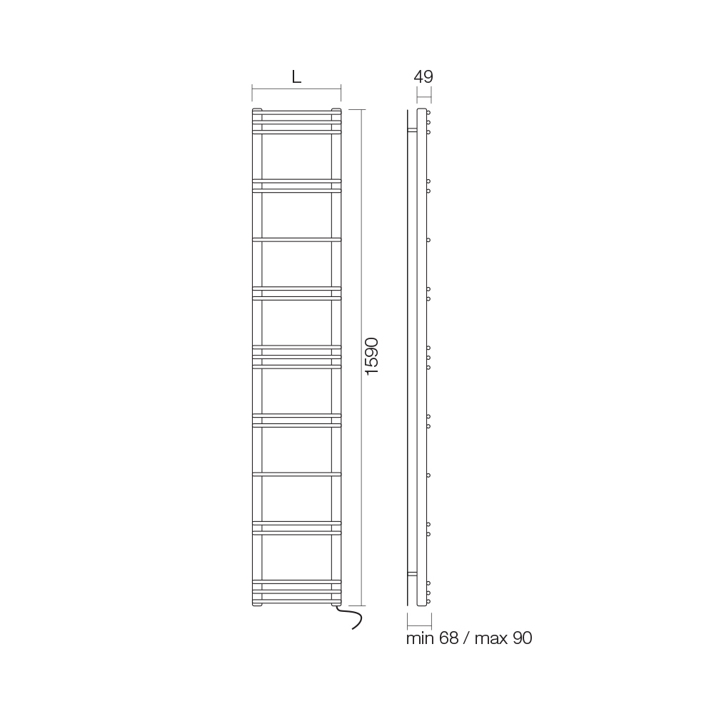 Electric towel warmer in jet black finish carbon steel with horizontal elements and vertical collectors entirely made in Italy with wall fixing kit included . Electrification kit positioned at the bottom right.