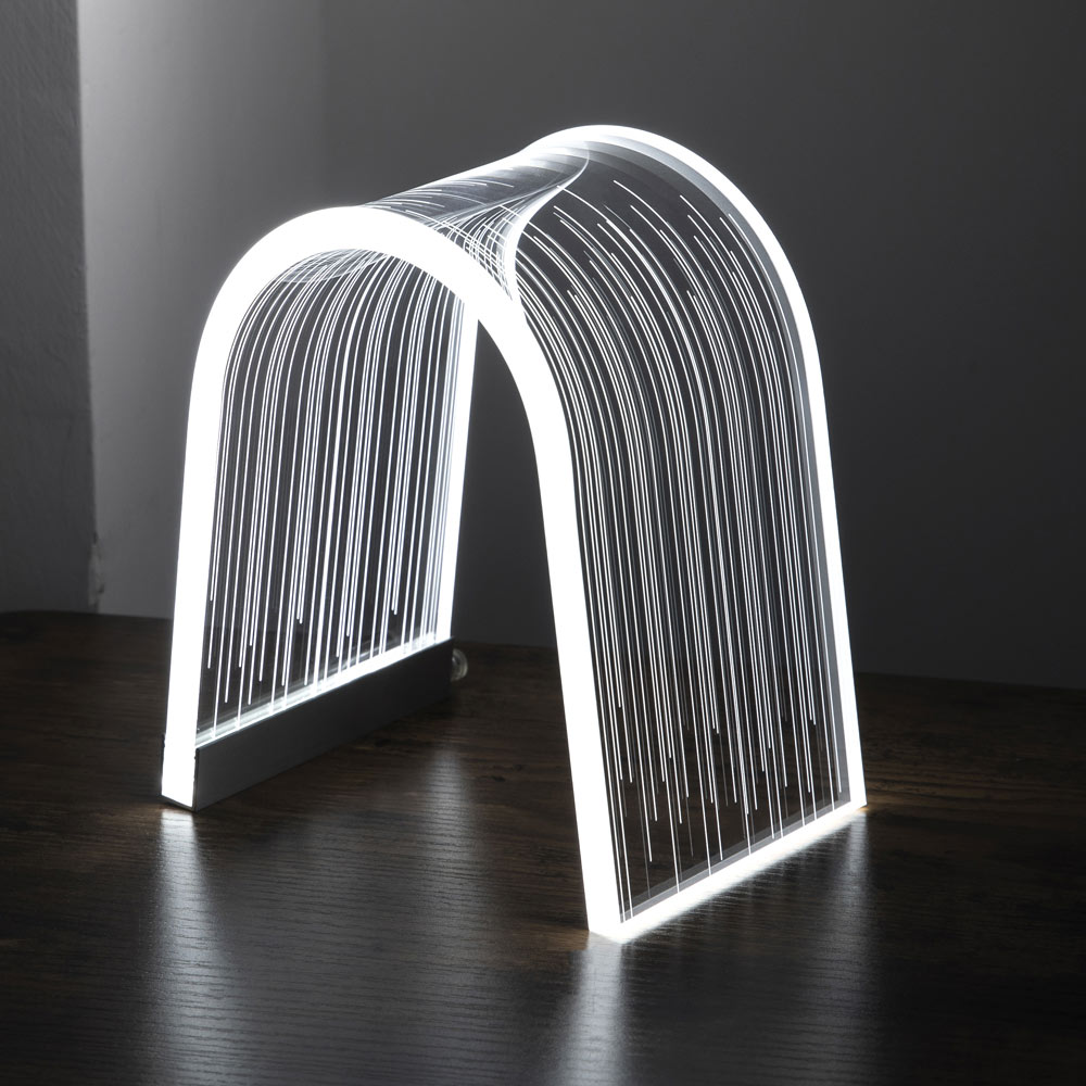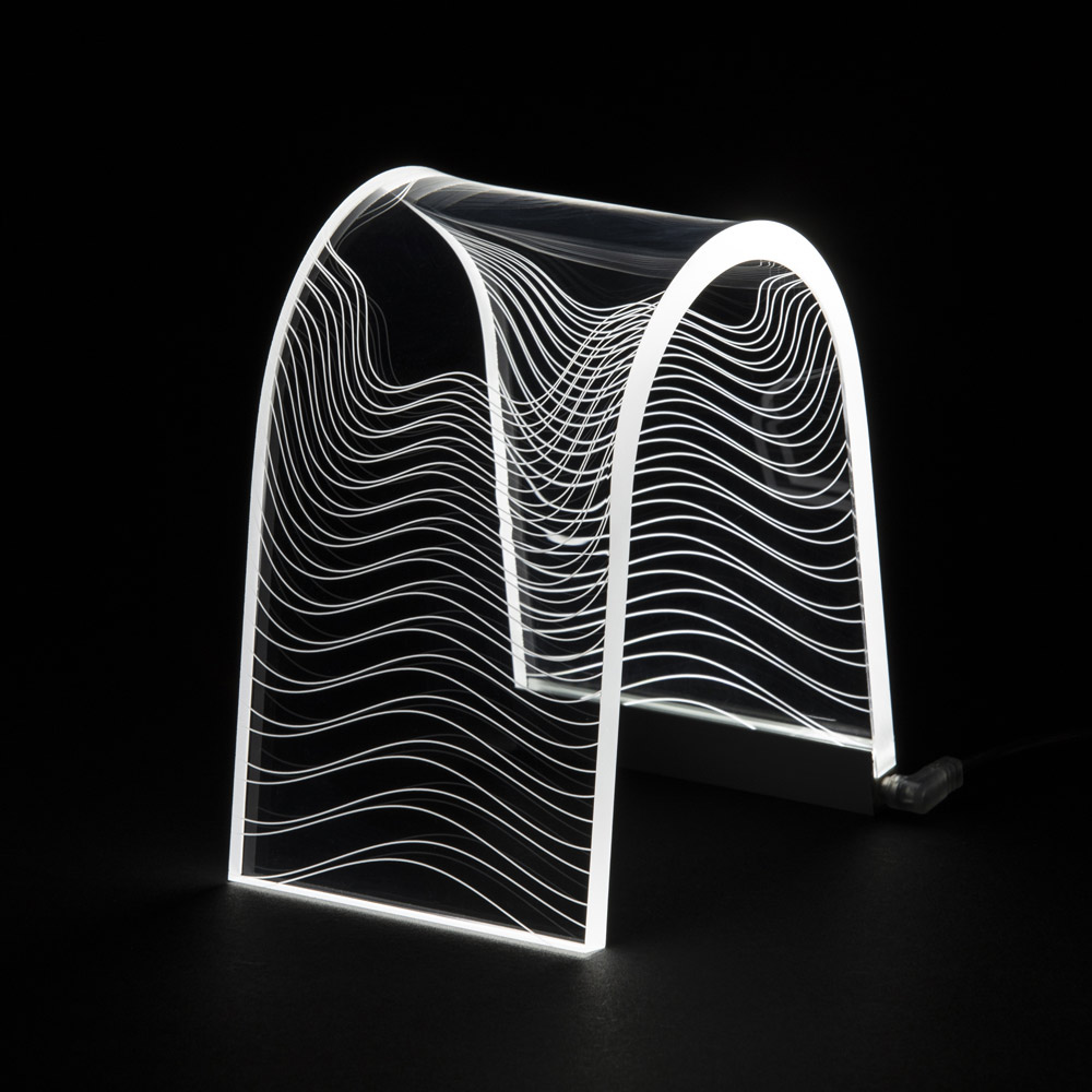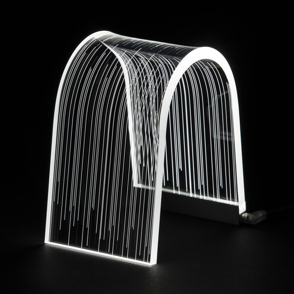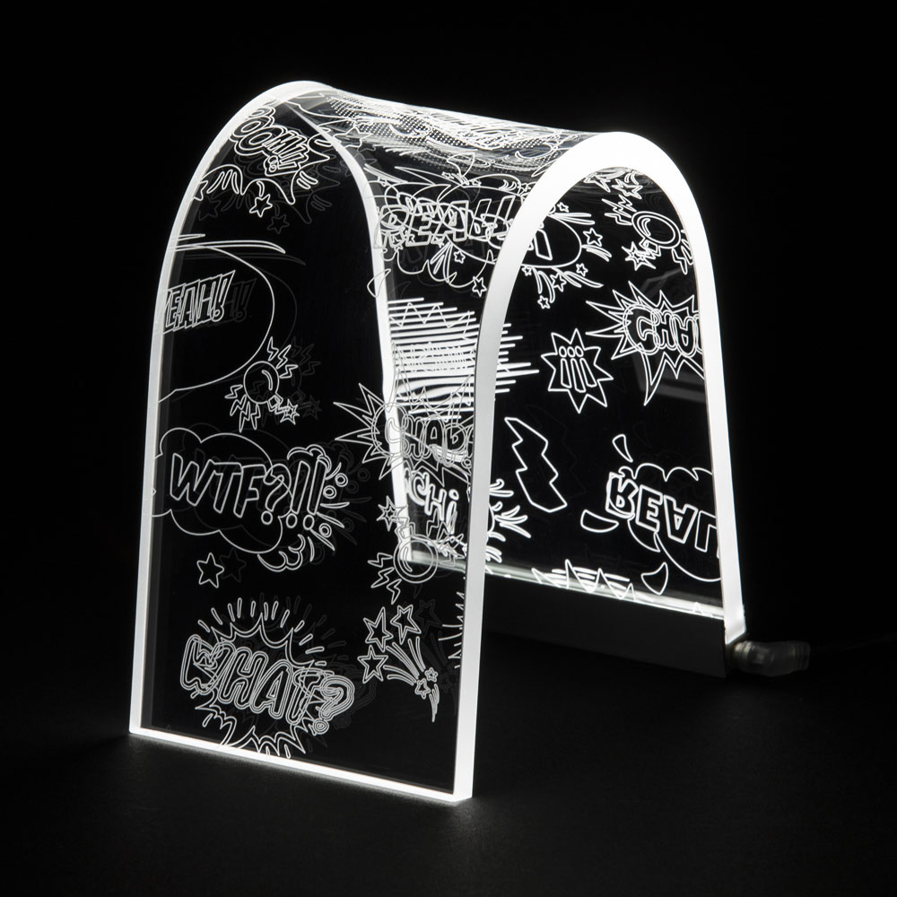 This table lamp is entirely made of clear acrylic crystal with laser-engraved decoration of various motifs. It is characterized by its contemporary and modern arch shape.