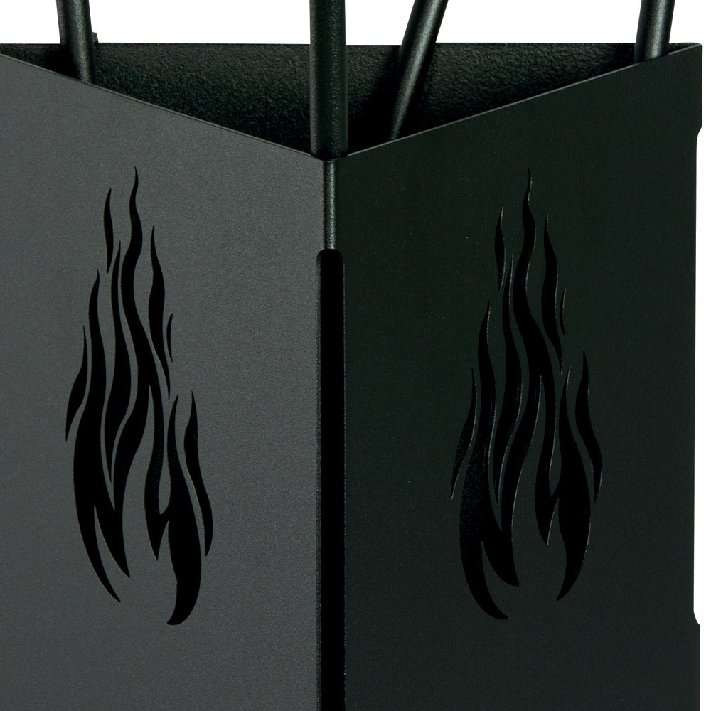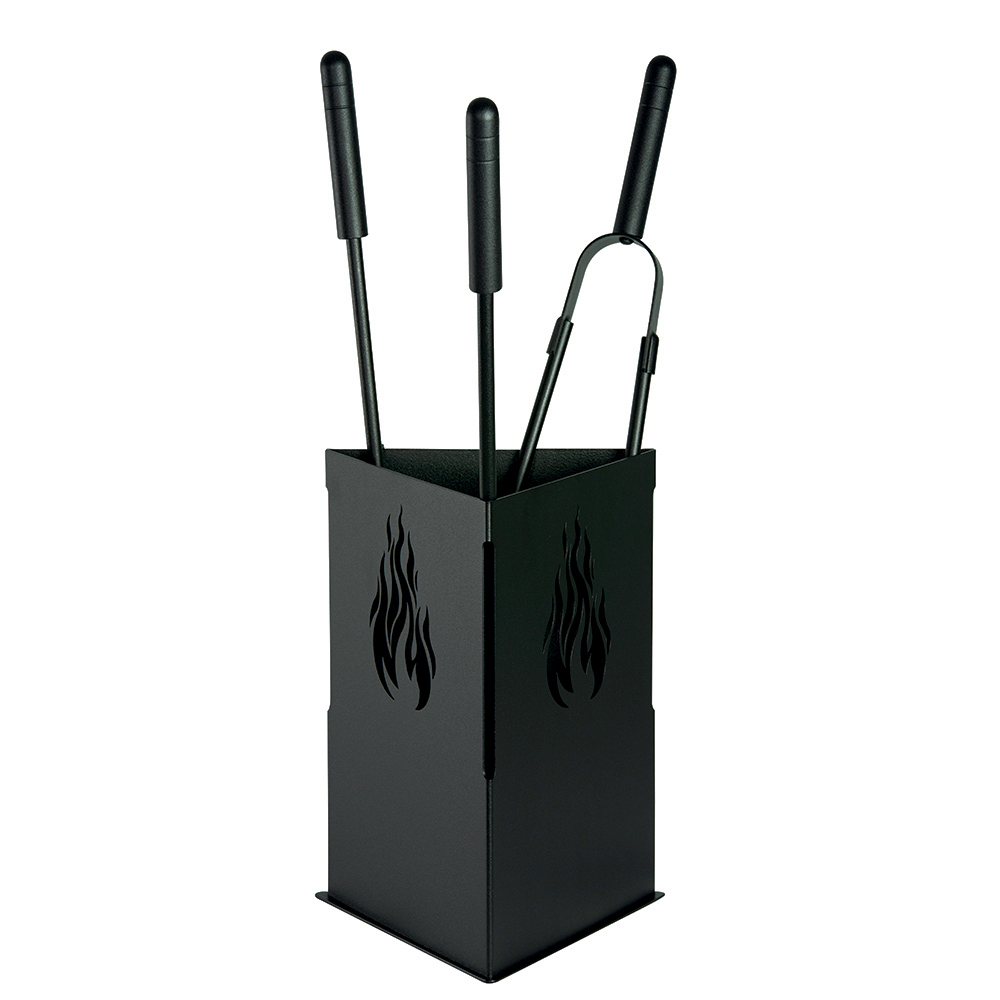 This elegant tool holder for the fireplace combines practicality and modern design, combining the robustness of metal with the fine black or anthracite workmanship. Its triangular appearance is embellished with flame cuts on the sides, which enrich the aesthetics. This tool holder is a must for keeping your fireplace area tidy and functional. Its compact structure makes it ideal for any space, ensuring that everything you need to care for your fireplace is always organized and within reach.