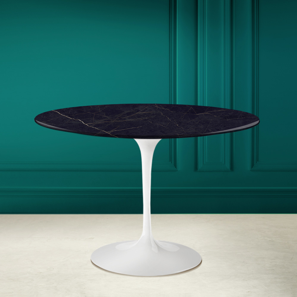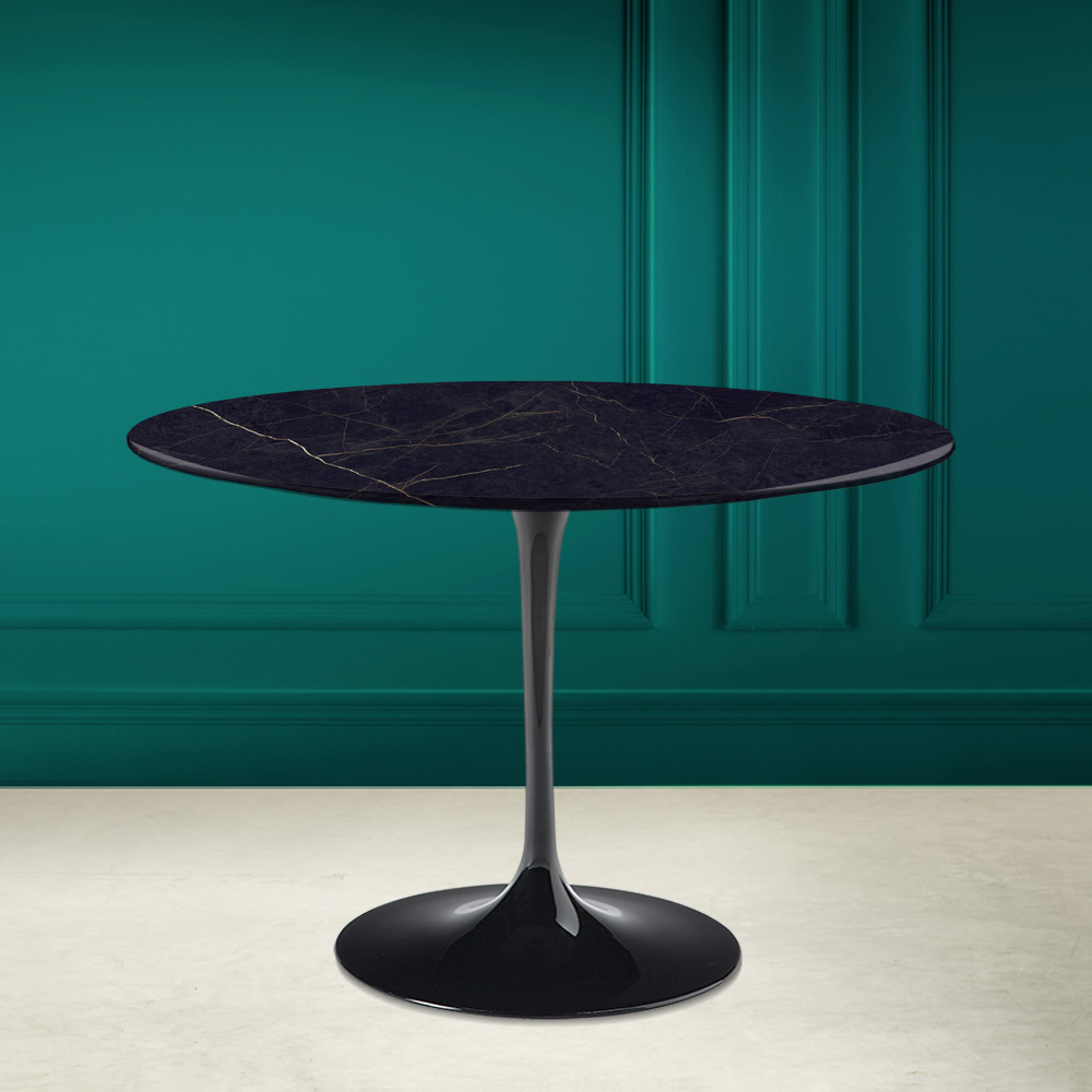 Dining table with round top in noir laurent ceramic and base in polished aluminium Made in Italy