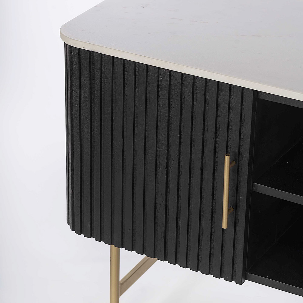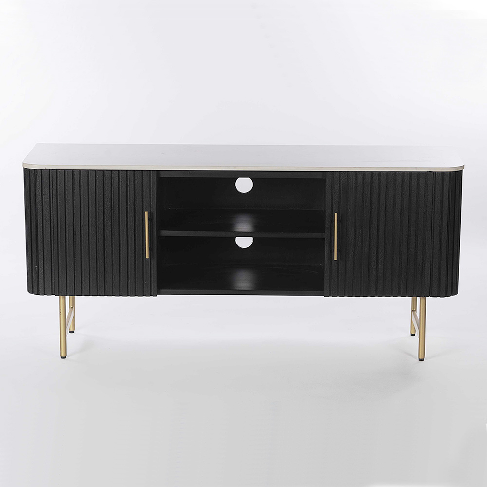 This TV stand is the essence of contemporary elegance, combining modern design and functionality . The black grooved wooden frame gives a sophisticated three-dimensional effect, perfectly balanced by the smooth top that adds a refined touch. The thin yet sturdy golden metal legs give visual lightness and ensure stability.