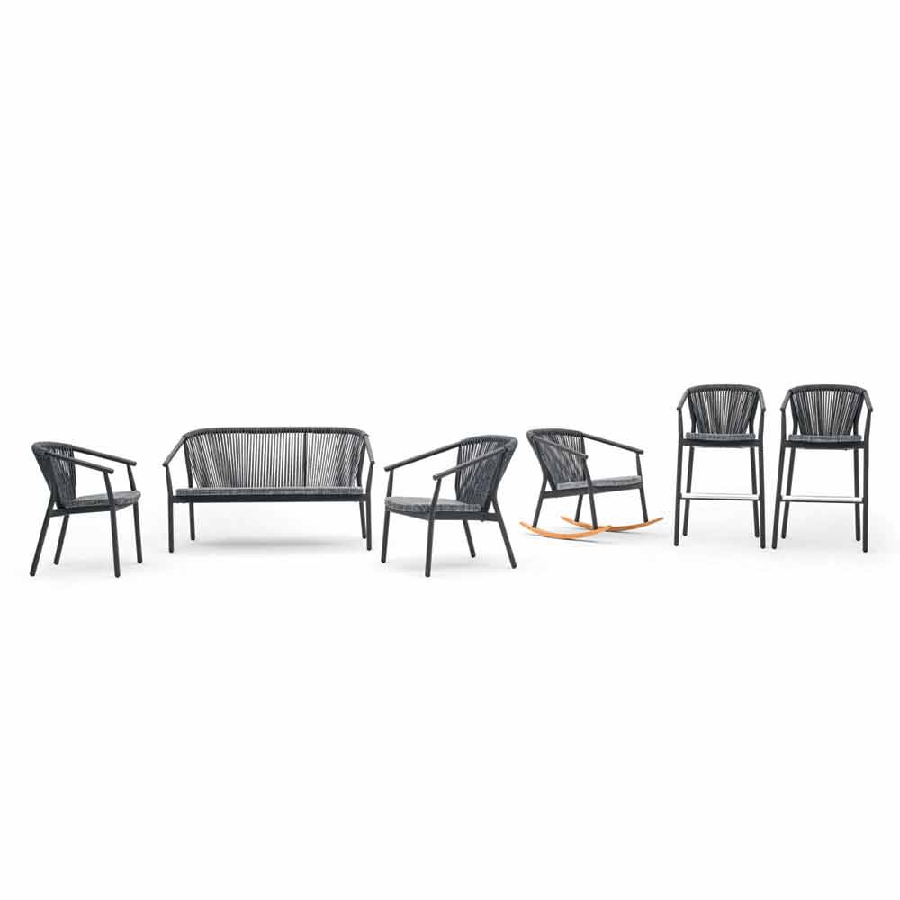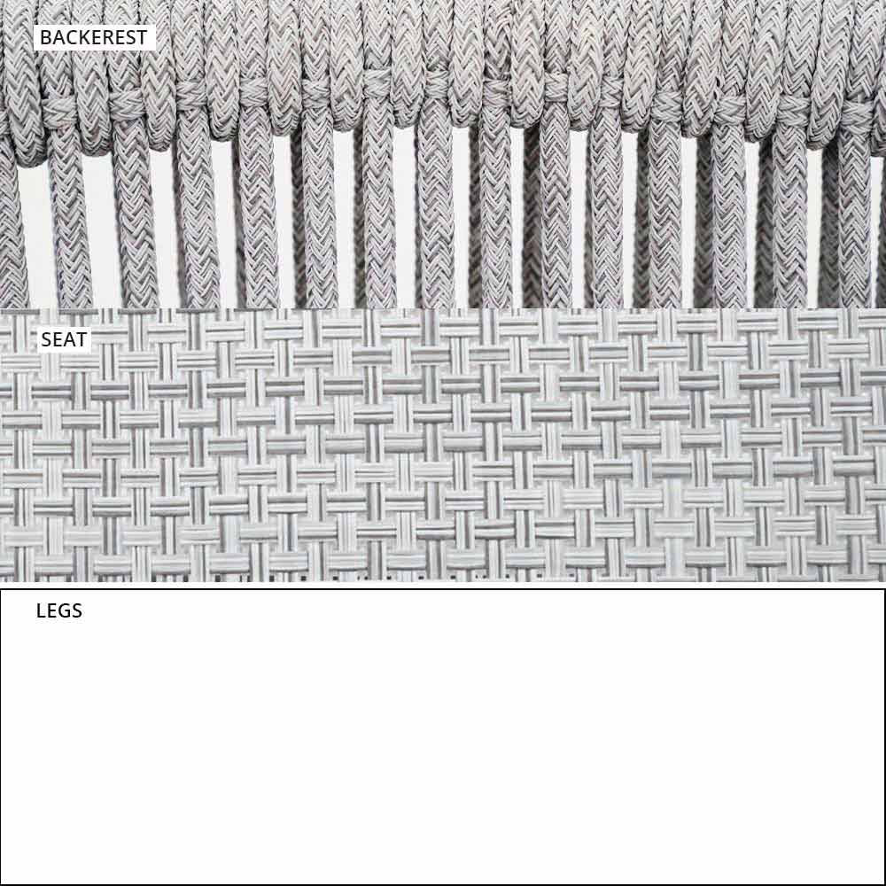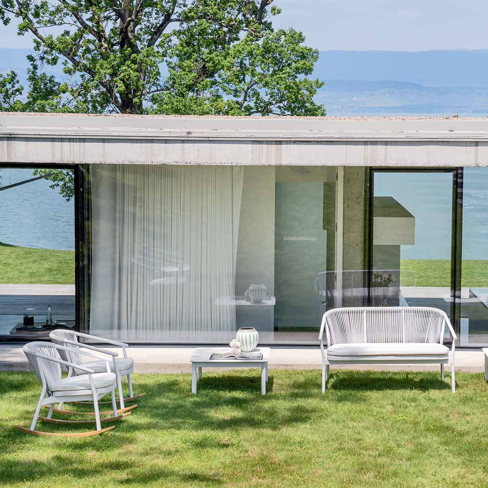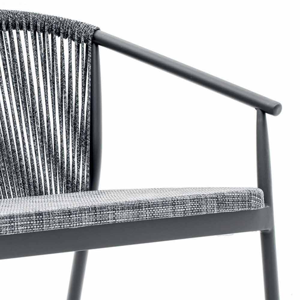 The intertwining of the backrest in VAR # TEX synthetic cord enhances the aesthetics of this sofa designed to enjoy outdoor days in company.
