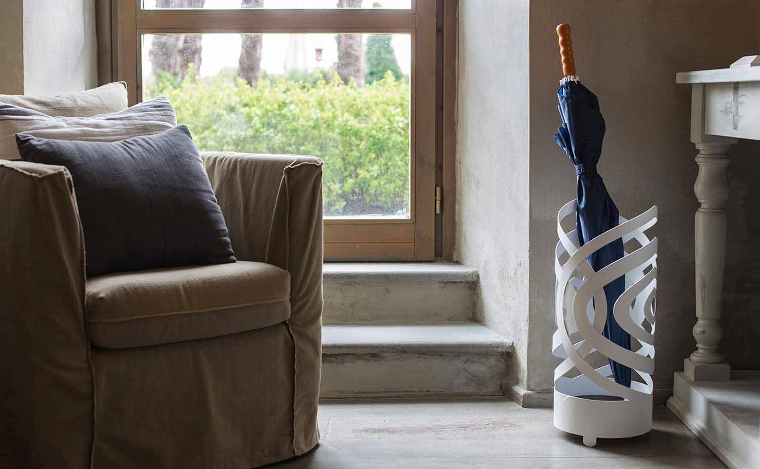 umbrella stand is outlined by particular queues recalling the shape of intertwined ribbons.