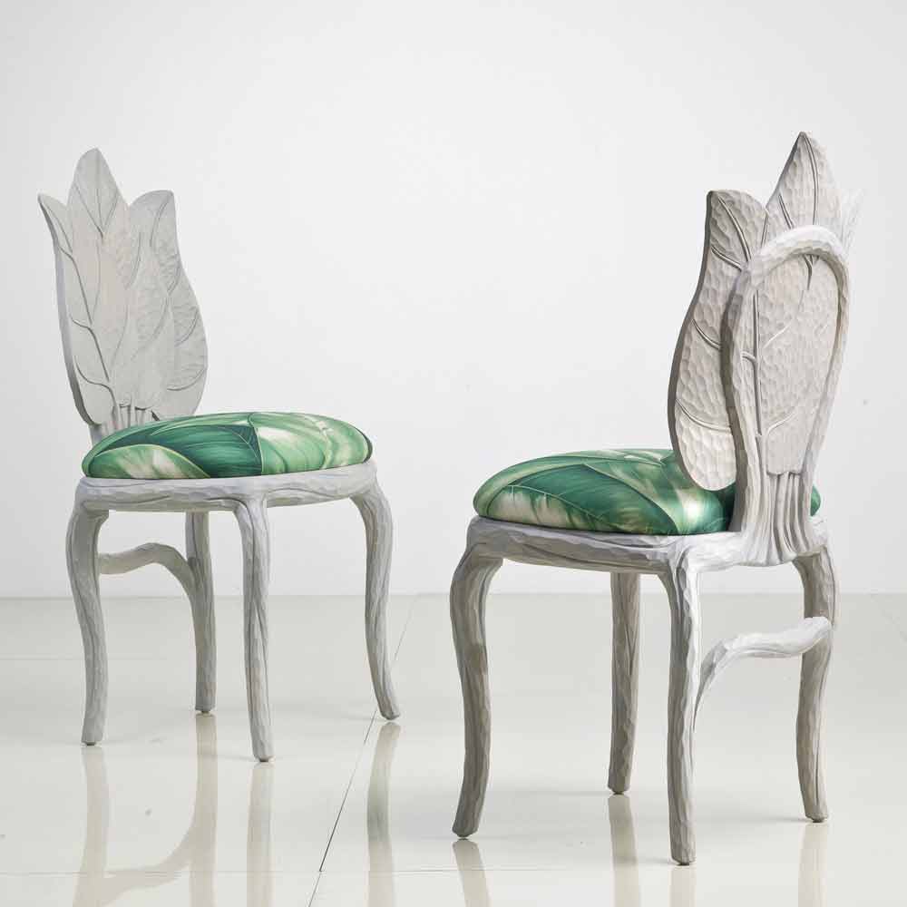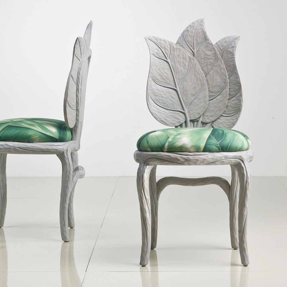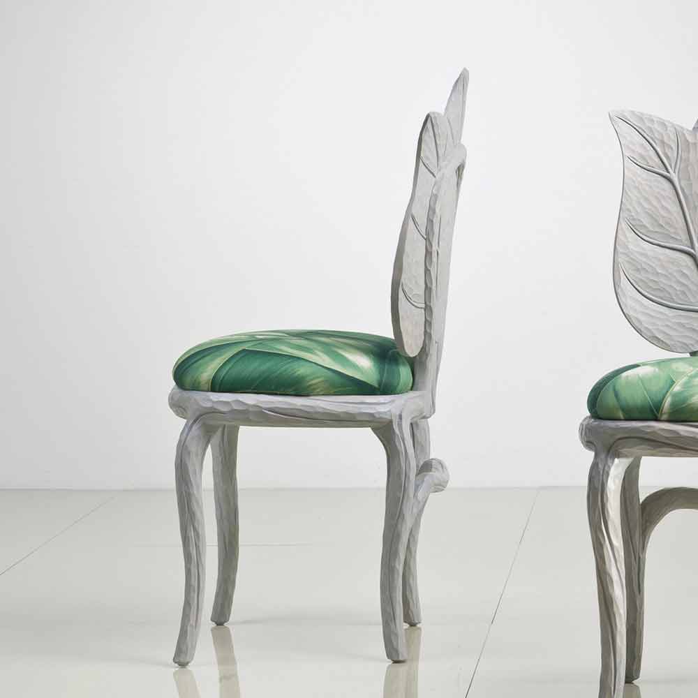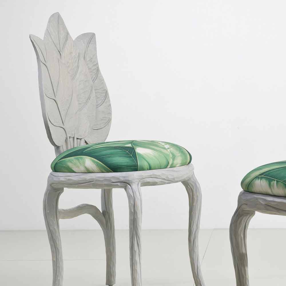 Dining chair with backrest composed of 3 carved leaves, seat padded with fireproof rubber. The solid wood structure reproduces the shapes of a bunch of leaves carved in the wood and whose legs are innervated by thin branches, the same motif that is taken up by the upholstery fabric of the seat, in a fresh mix of foliage and energetic shades. Smoky grey finish.