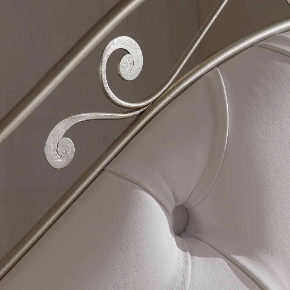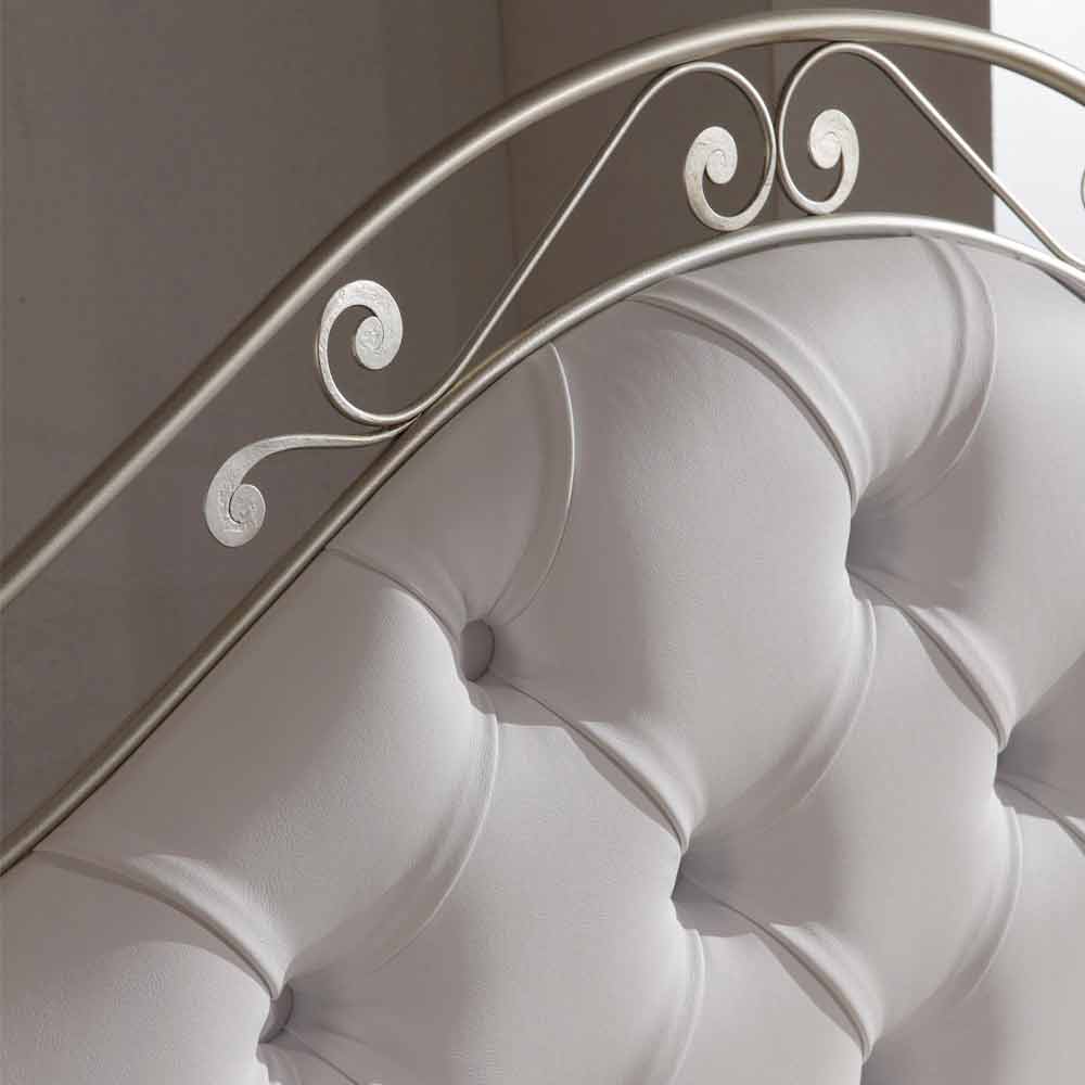 This bed is handmade in Italy by expert crafstmen and it has a patinated silver finish. The heaboard is padded and covered with white faux leather.