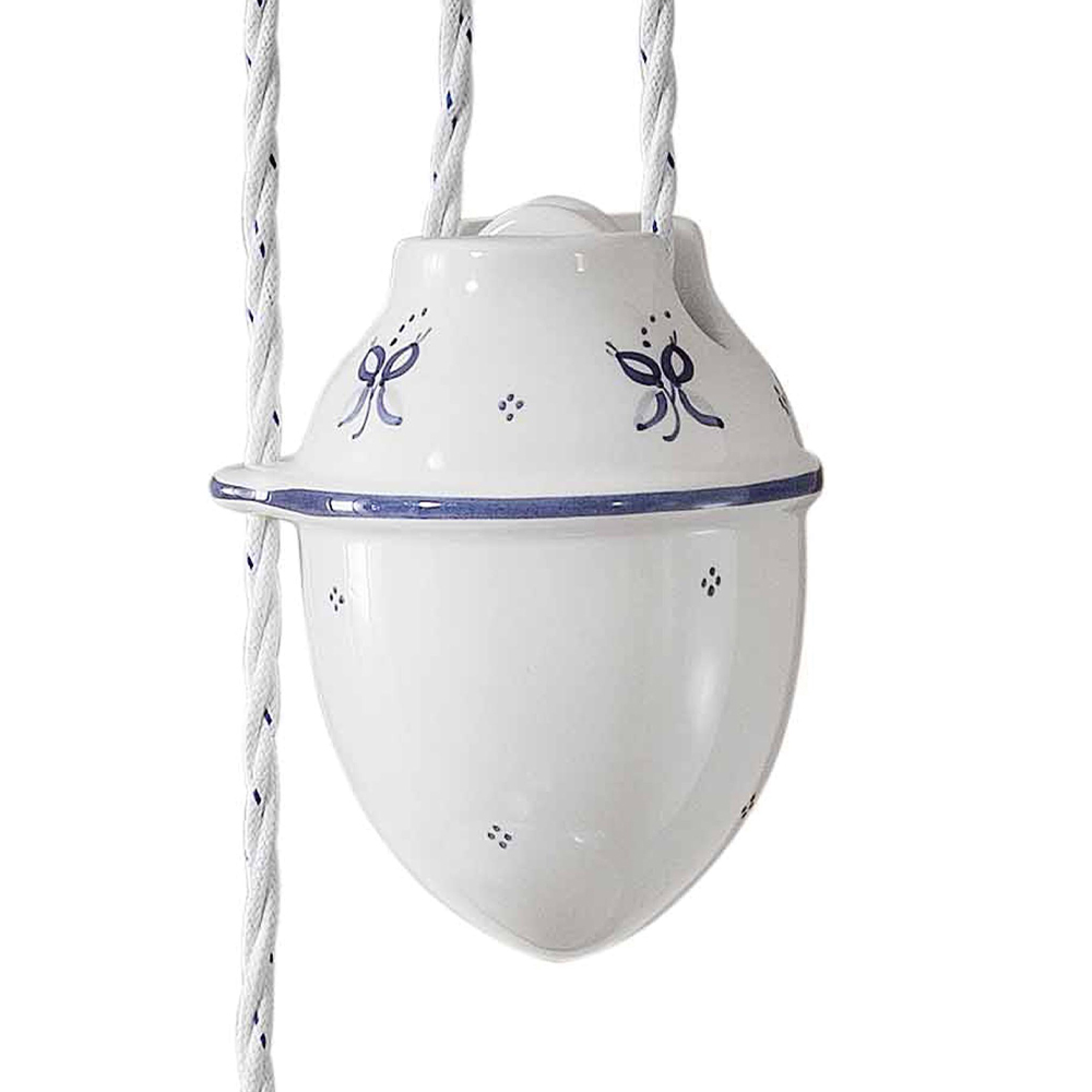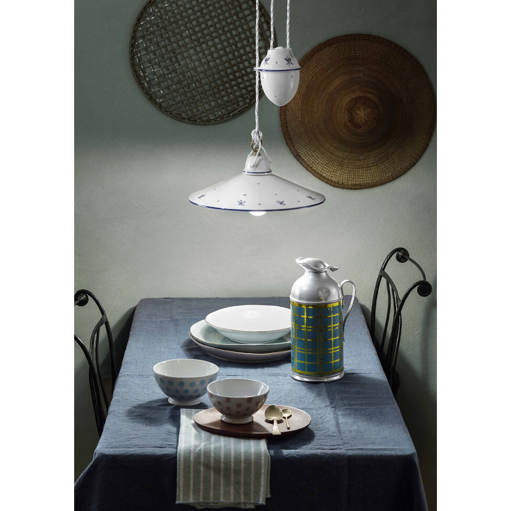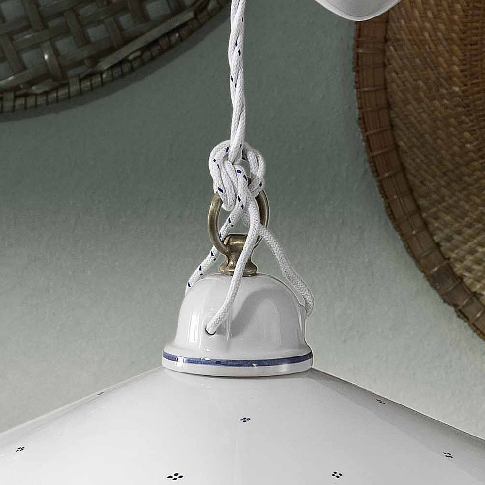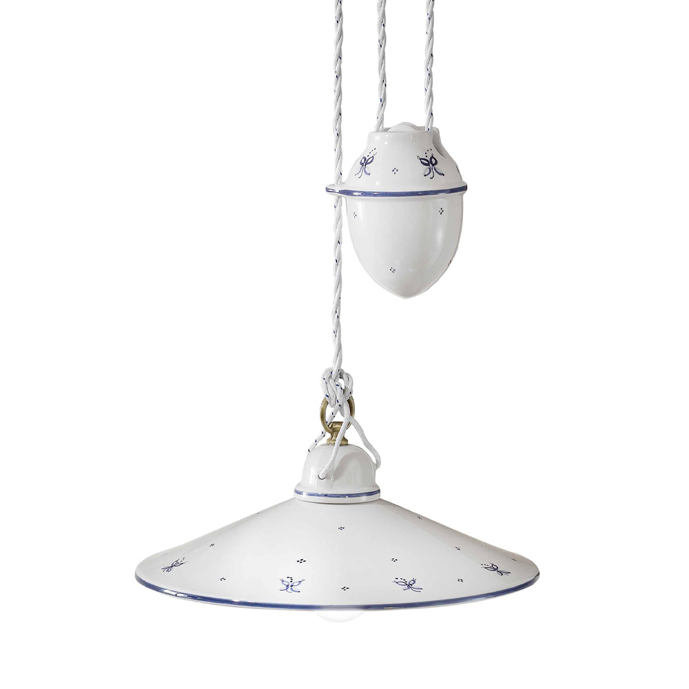 Hanging lamp with ups and downs in hand-painted iron and ceramic, vintage 2 sizes, made in Italy by Ferroluce.