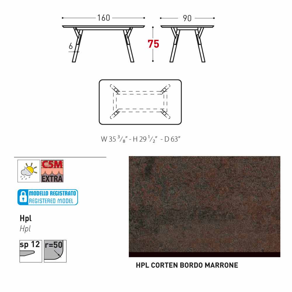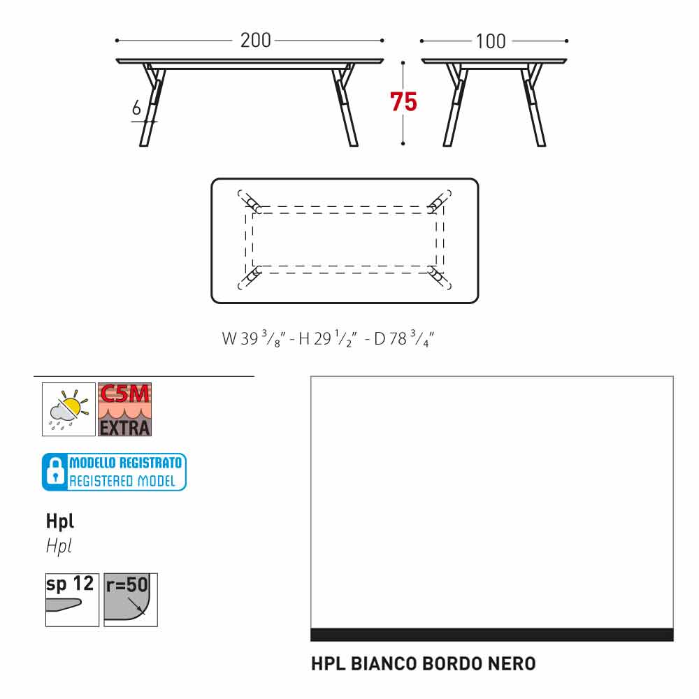 HPL technical features : High-pressure laminates. They are made of several layers of paper (70%) impregnated with thermosetting resins (30%) and compacted for about 45-50 minutes through the combined action of heat ( at about 150 degrees) and high pressure (greater than 7 MPa / Megapascal per square metre.) The result is a stable, nonreactive, non-porous and high-density product. It has physical and chemical features of high mechanical strength (controlled temperature excursion +80/-40 degrees, for less than 30 seconds at extreme temperatures). It resists to light exposure and temperature variations, even in marine environments.