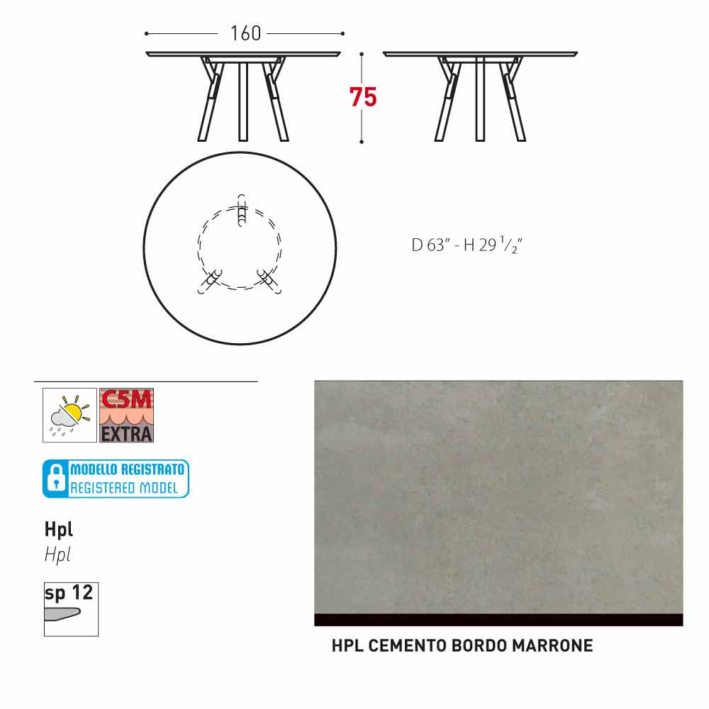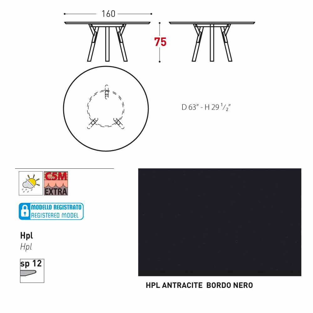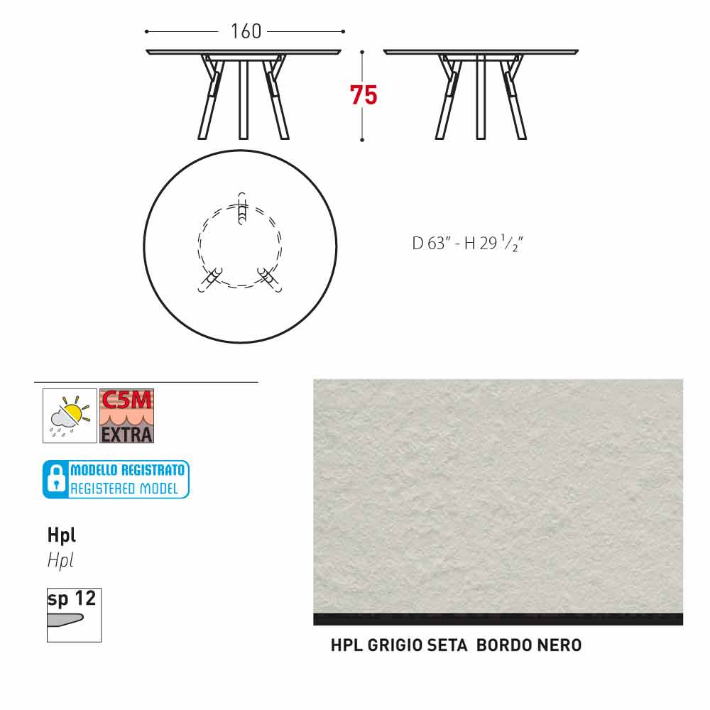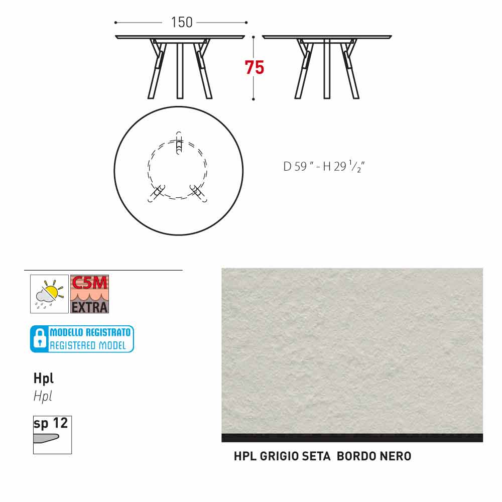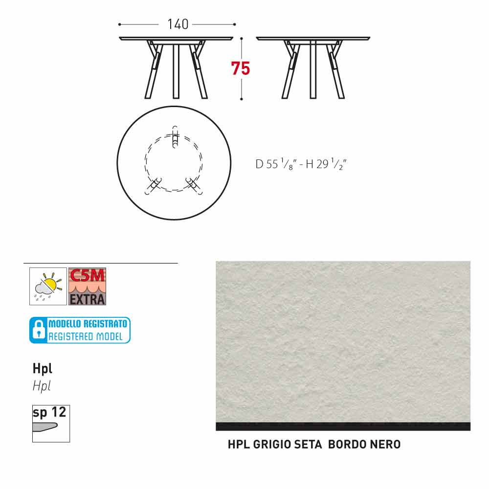 HPL technical features : High-pressure laminates. They are made of several layers of paper (70%) impregnated with thermosetting resins (30%) and compacted for about 45-50 minutes through the combined action of heat ( at about 150 degrees) and high pressure (greater than 7 MPa / Megapascal per square metre.) The result is a stable, nonreactive, non-porous and high-density product. It has physical and chemical features of high mechanical strength (controlled temperature excursion +80/-40 degrees, for less than 30 seconds at extreme temperatures). It resists to light exposure and temperature variations, even in marine environments.