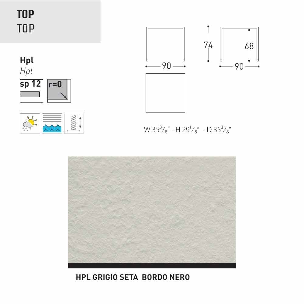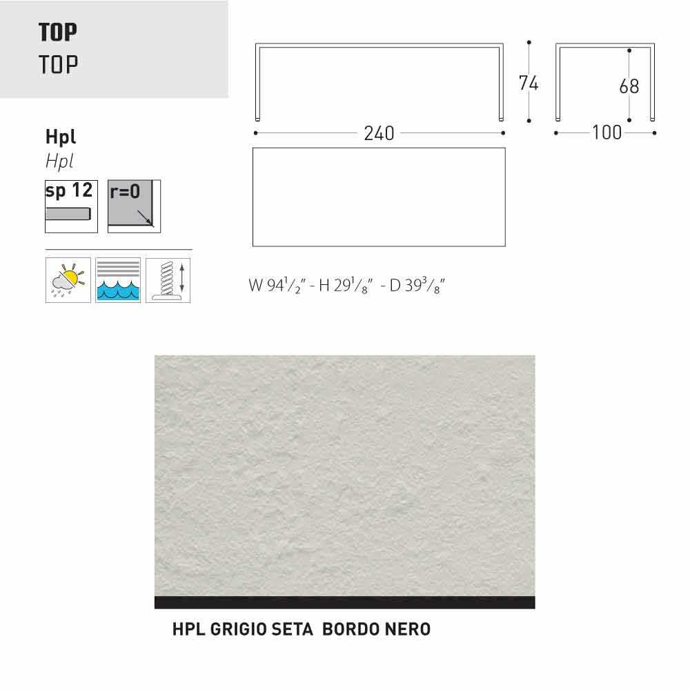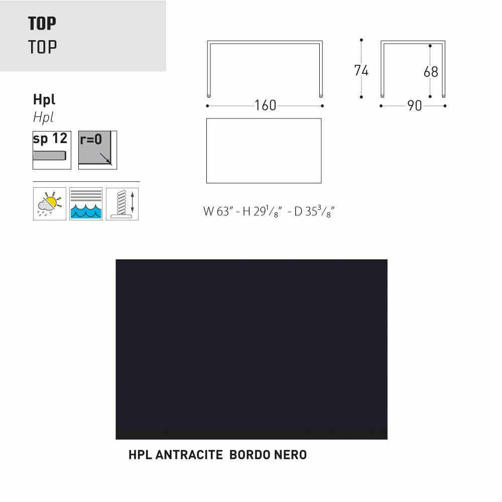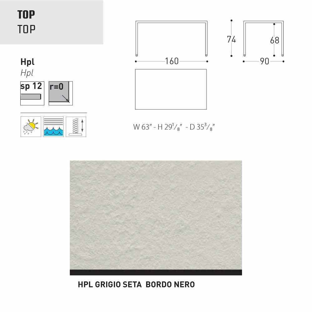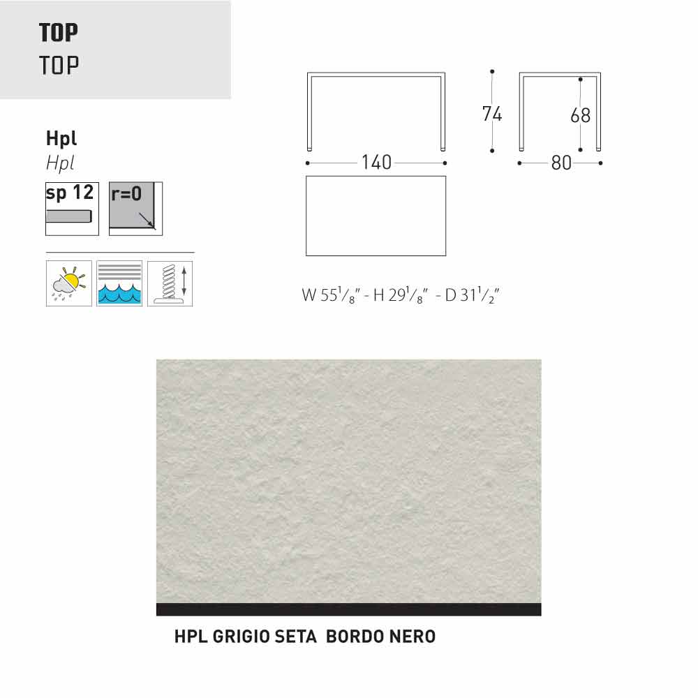 HPL technical features : High-pressure laminates. They are made of several layers of paper (70%) impregnated with thermosetting resins (30%) and compacted for about 45-50 minutes through the combined action of heat ( at about 150 degrees) and high pressure (greater than 7 MPa / Megapascal per square metre.) The result is a stable, nonreactive, non-porous and high-density product. It has physical and chemical features of high mechanical strength (controlled temperature excursion +80/-40 degrees, for less than 30 seconds at extreme temperatures). It resists to light exposure and temperature variations, even in marine environments.