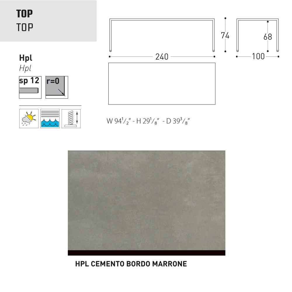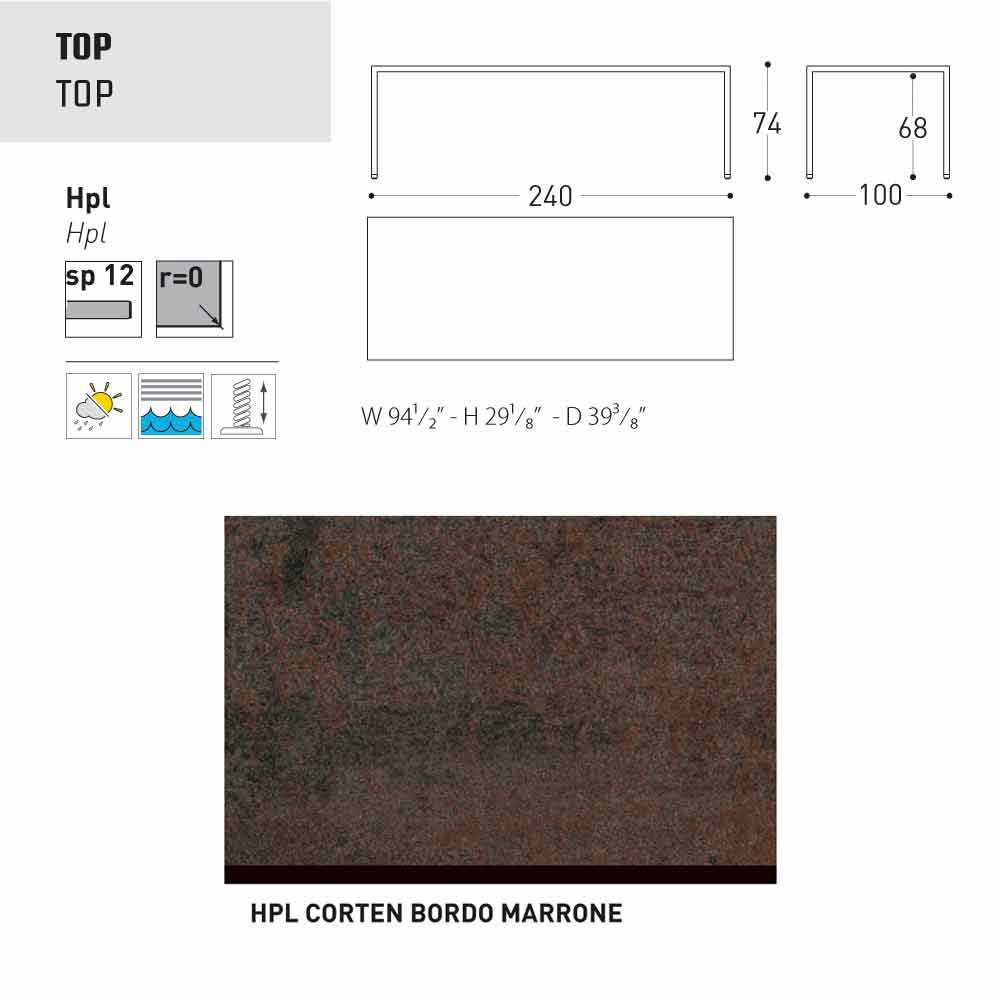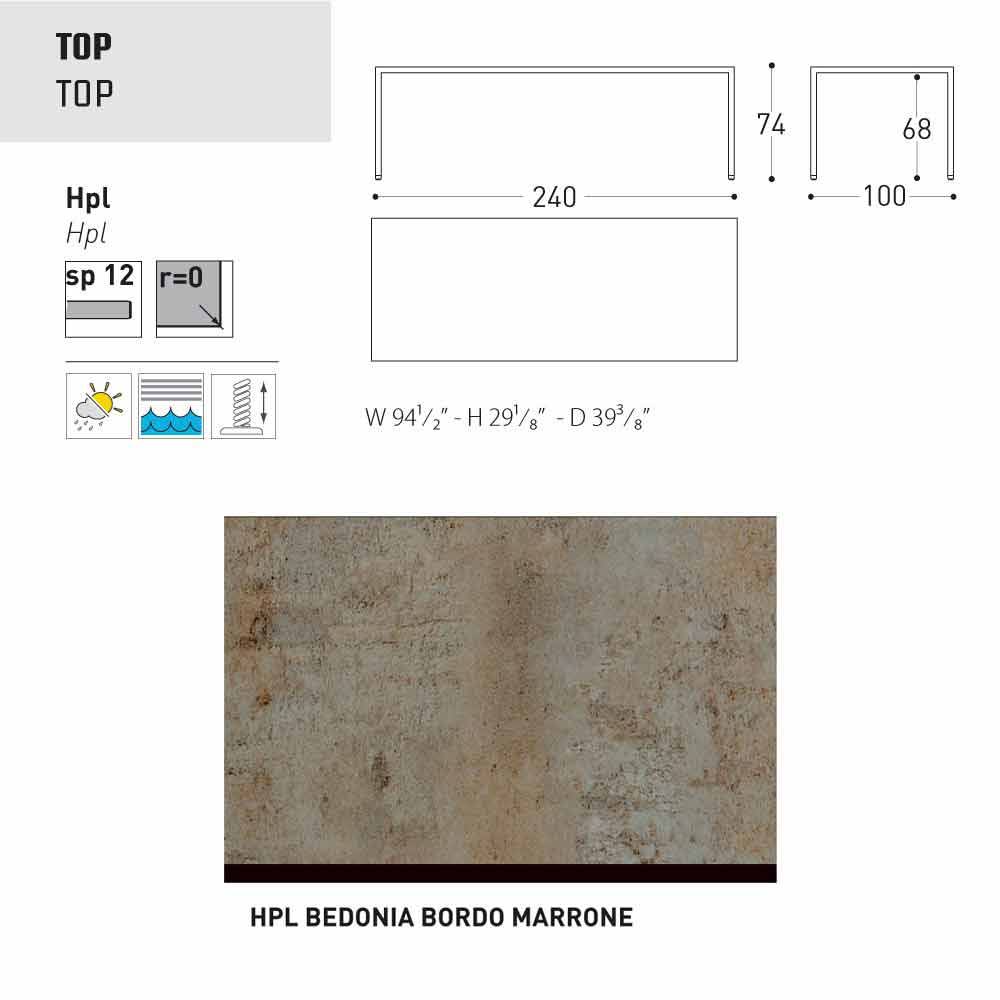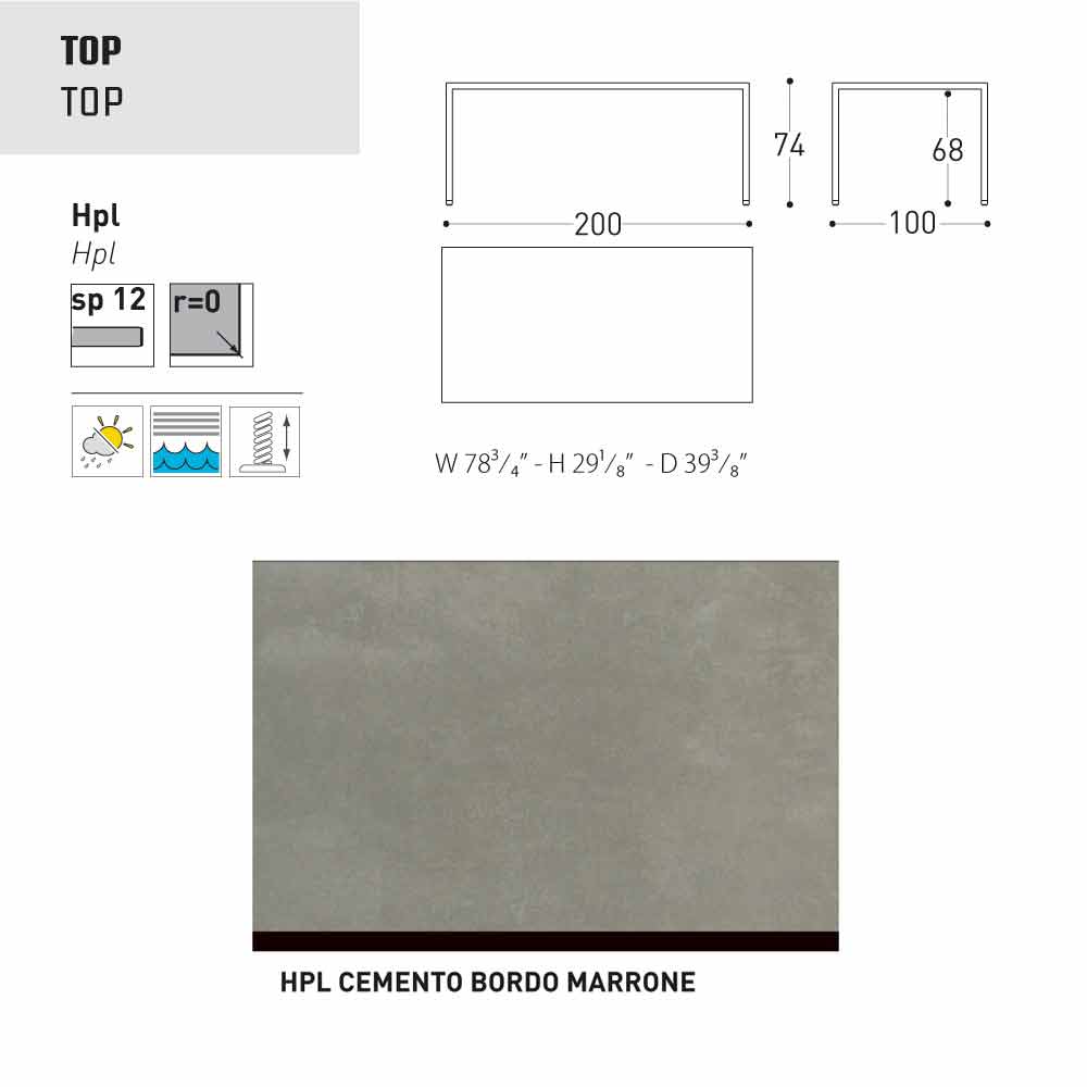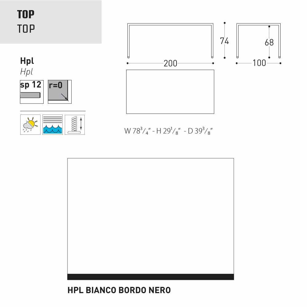 HPL technical features : High-pressure laminates. They are made of several layers of paper (70%) impregnated with thermosetting resins (30%) and compacted for about 45-50 minutes through the combined action of heat ( at about 150 degrees) and high pressure (greater than 7 MPa / Megapascal per square metre.) The result is a stable, nonreactive, non-porous and high-density product. It has physical and chemical features of high mechanical strength (controlled temperature excursion +80/-40 degrees, for less than 30 seconds at extreme temperatures). It resists to light exposure and temperature variations, even in marine environments.