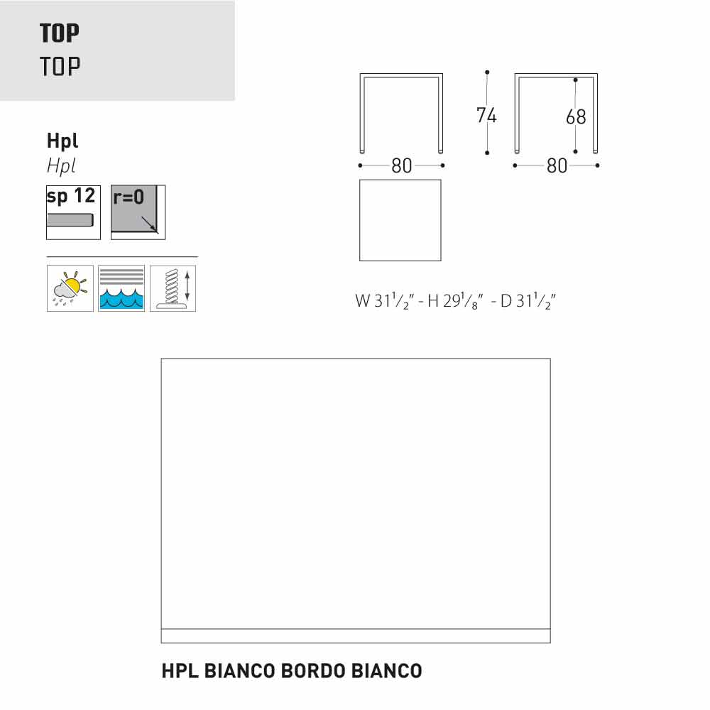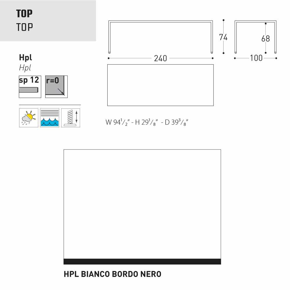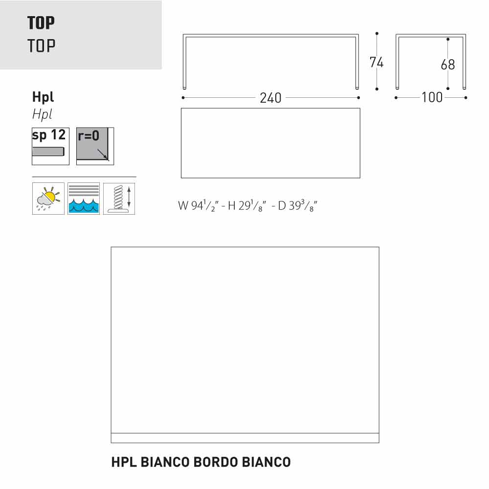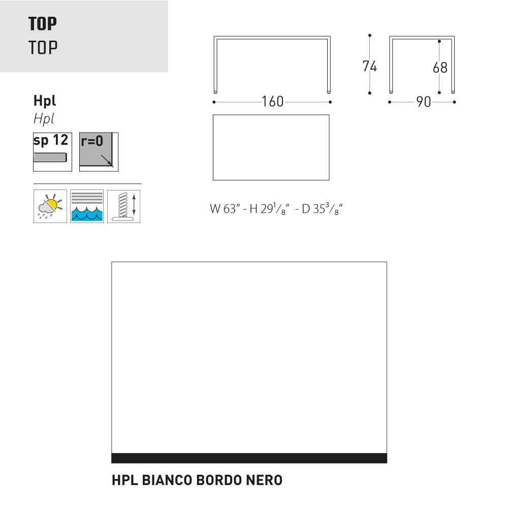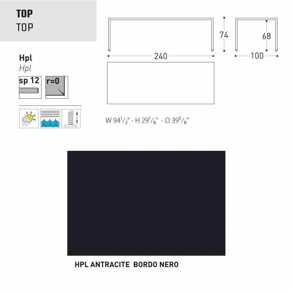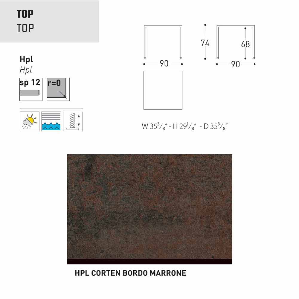 HPL technical features : High-pressure laminates. They are made of several layers of paper (70%) impregnated with thermosetting resins (30%) and compacted for about 45-50 minutes through the combined action of heat ( at about 150 degrees) and high pressure (greater than 7 MPa / Megapascal per square metre.) The result is a stable, nonreactive, non-porous and high-density product. It has physical and chemical features of high mechanical strength (controlled temperature excursion +80/-40 degrees, for less than 30 seconds at extreme temperatures). It resists to light exposure and temperature variations, even in marine environments.