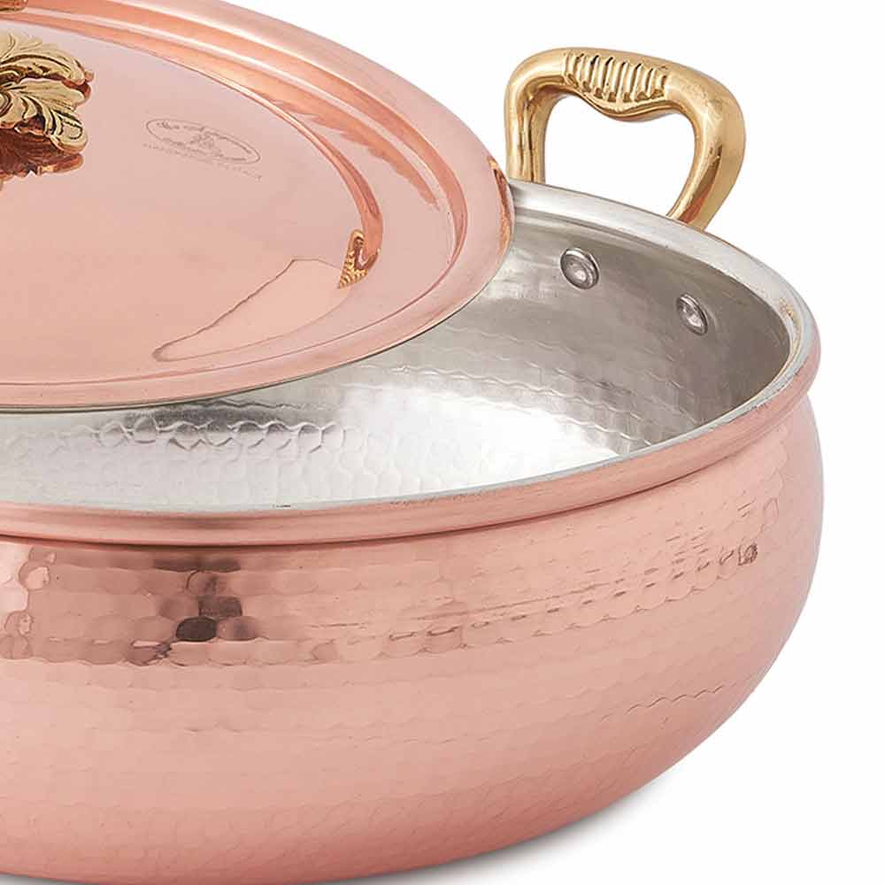 vegetable dish with lid and brass handles is a rounded saucepan in hammered solid copper ideal for slow cooking such as legumes, meat sauce and game, etc.