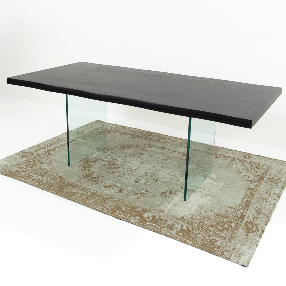 Modern dining table with veneered wood top and transparent glass base made in Italy.