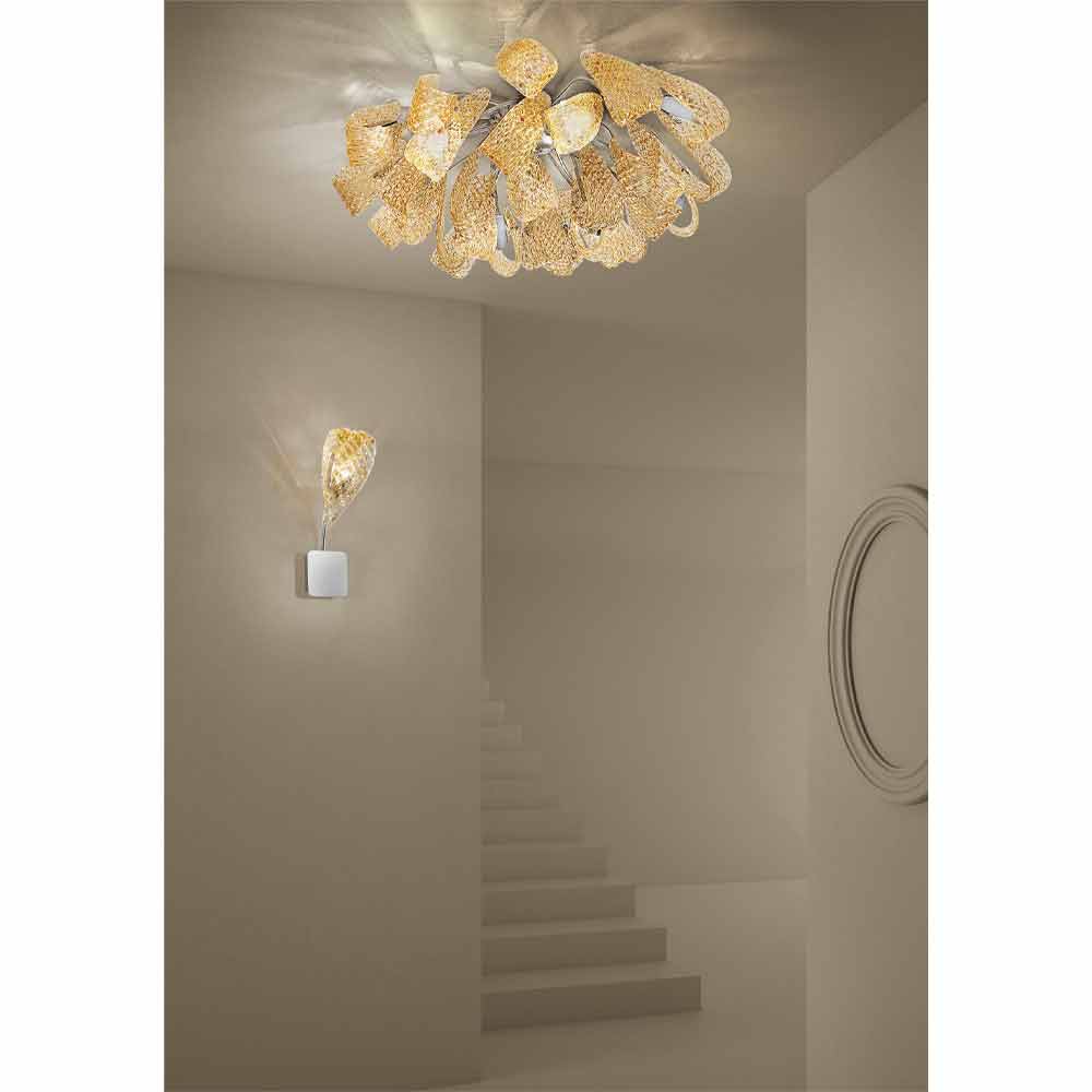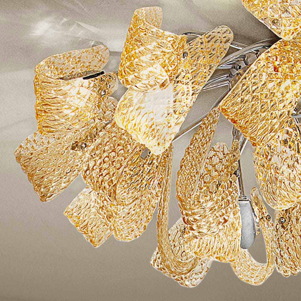 Elegant and majestic ceiling lamp made in Italy in hand-crafted amber-finish Venetian glass with details in polished chrome metal . An idea of lighting composed of voluptuous ribbons and unusual textures that give its aesthetic originality and a sense of dynamism . What is striking is the geometric texture that covers the glass surface on which the light is reflected in the metal details for wonderful plays of reflections . The result is a wonderful ceiling light capable of adapting to any contemporary environment and giving character to more classic spaces, proving to be particularly versatile.