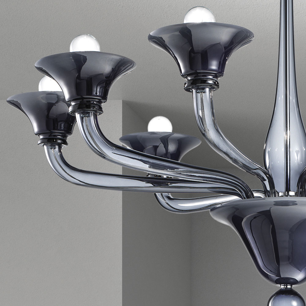 Chandelier handcrafted in Italy in Venice glass with milk white-grey finish with metal details in polished chrome finish . An unprecedented encounter between historical lines and contemporary design to give life to a piece of furniture with timeless charm and elegance. Its aesthetic is characterized by an articulated volume that becomes dynamic and light through the luminous vibration of the marvellous blown glass surfaces that alternate the elegant transparent arms with the cups made through the use of the casing technique . To underline its value is the attention to detail that transpires from the chromed metal components which allow the product to adapt to different tastes and situations of use.