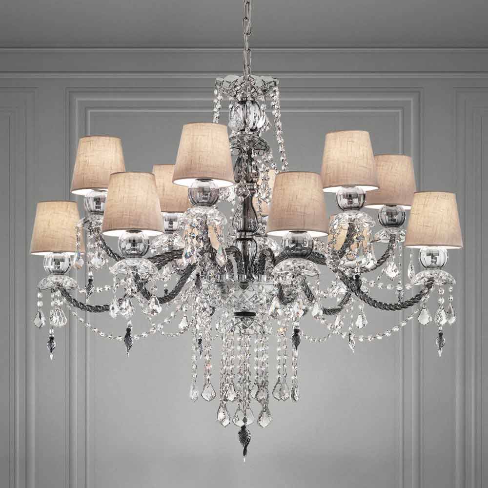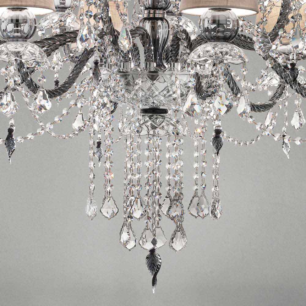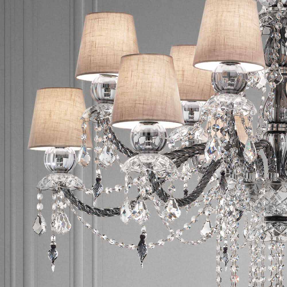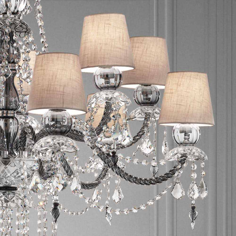 Elegant and imposing chandelier with 12 linen lampshades , structure in Venetian glass grey finish enriched by pendants in crystal finish and details in polished chrome metal , handcrafted in Italy . Characterized by a romantic character able to fill large rooms in an exclusive way, this chandelier stands out thanks to luminous pendants and refined lampshades that give life to a dynamic furnishing solution with a strong scenographic impact . To increase its value and to underline its aesthetic side is the presence of sequins which, through the refraction of light, give life to wonderful plays of light and shadow thanks to unprecedented colored flashes .
