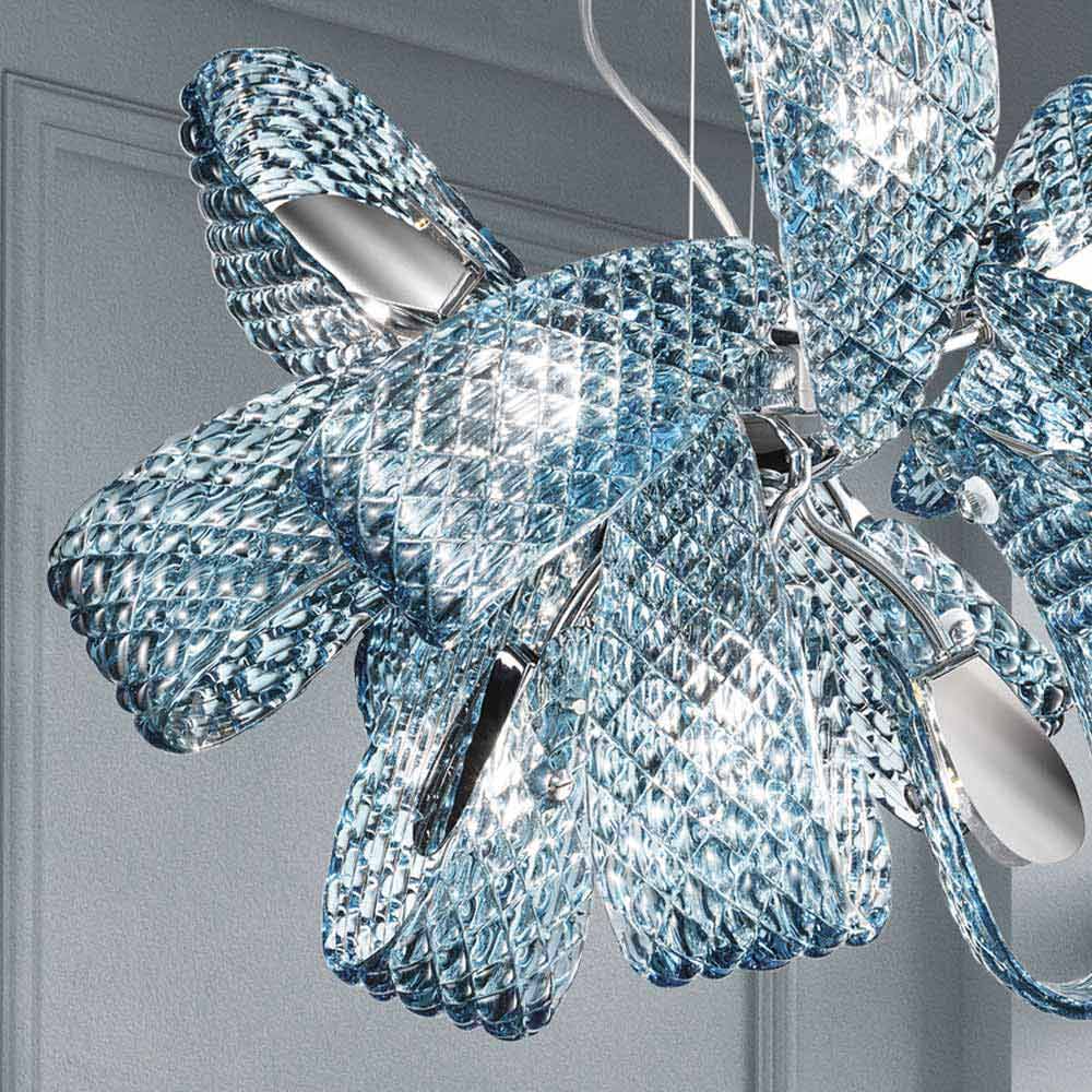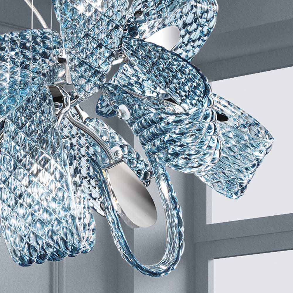 9 lights chandelier handcrafted in Italy in Venice with blue finish glass structure and polished chrome metal details. An idea of lighting composed of voluptuous ribbons and unusual textures that give its aesthetic originality and a sense of dynamism . Thanks to its eccentric and refined design and to the metal inserts that create contrast with the glass, an exclusive chandelier is born, capable of characterizing any environment with a touch of lightness, giving life to wonderful plays of light .
