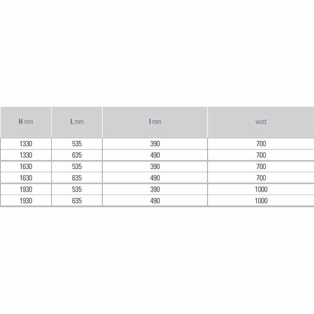 - H 1820 x L 635 x Inter. 560 x P 63 mm x Output w 1000;