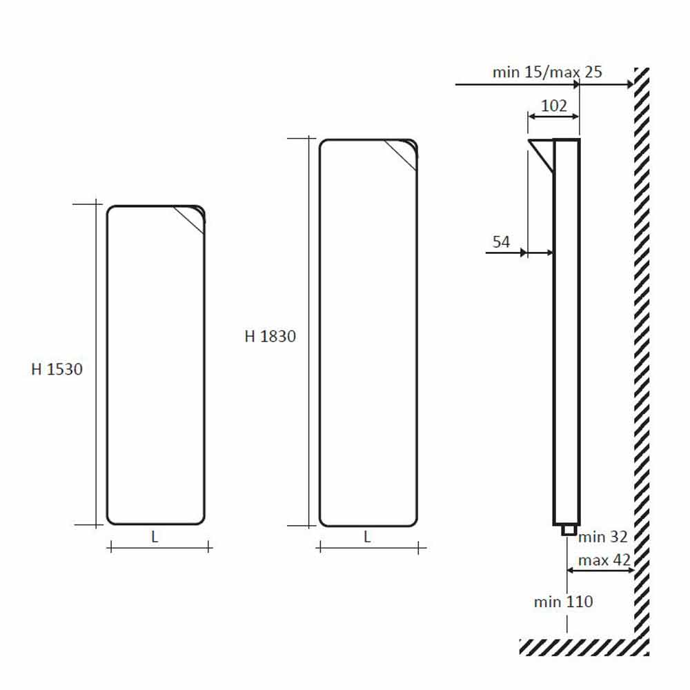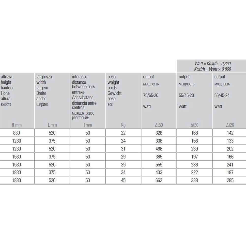 - H 1530 x L 375 x Inter. 50 x P 48 mm x Output w (Īt50 °) 385; Yield w (Īt30 °) 197; Yield w (Īt26 °) 166