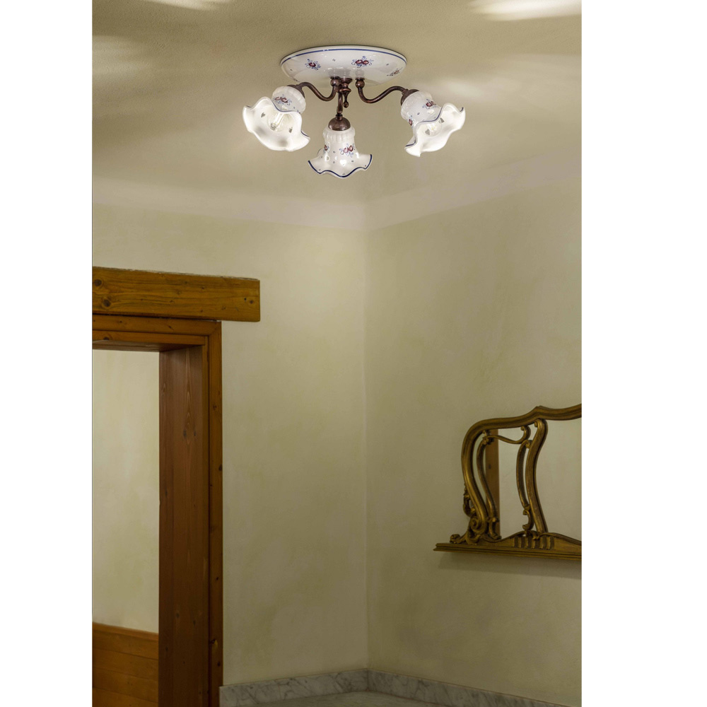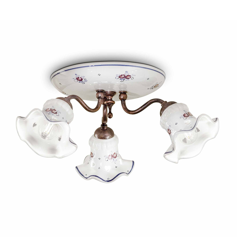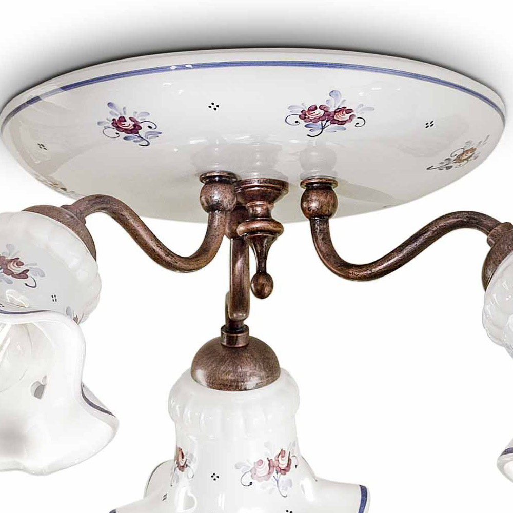 Round ceiling lamp 3 lights in iron and hand-decorated ceramic, made in Italy by Ferroluce.