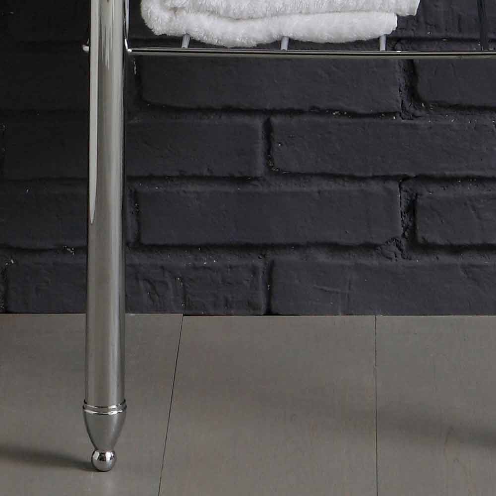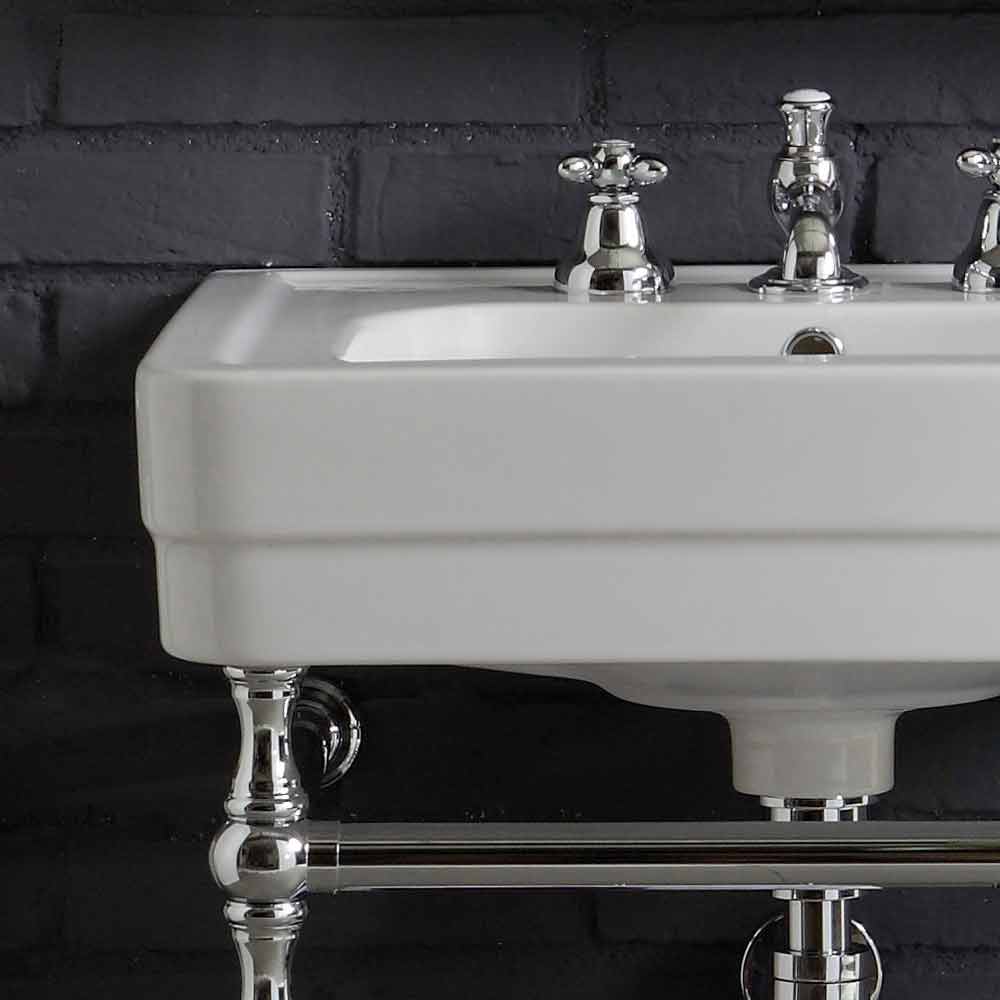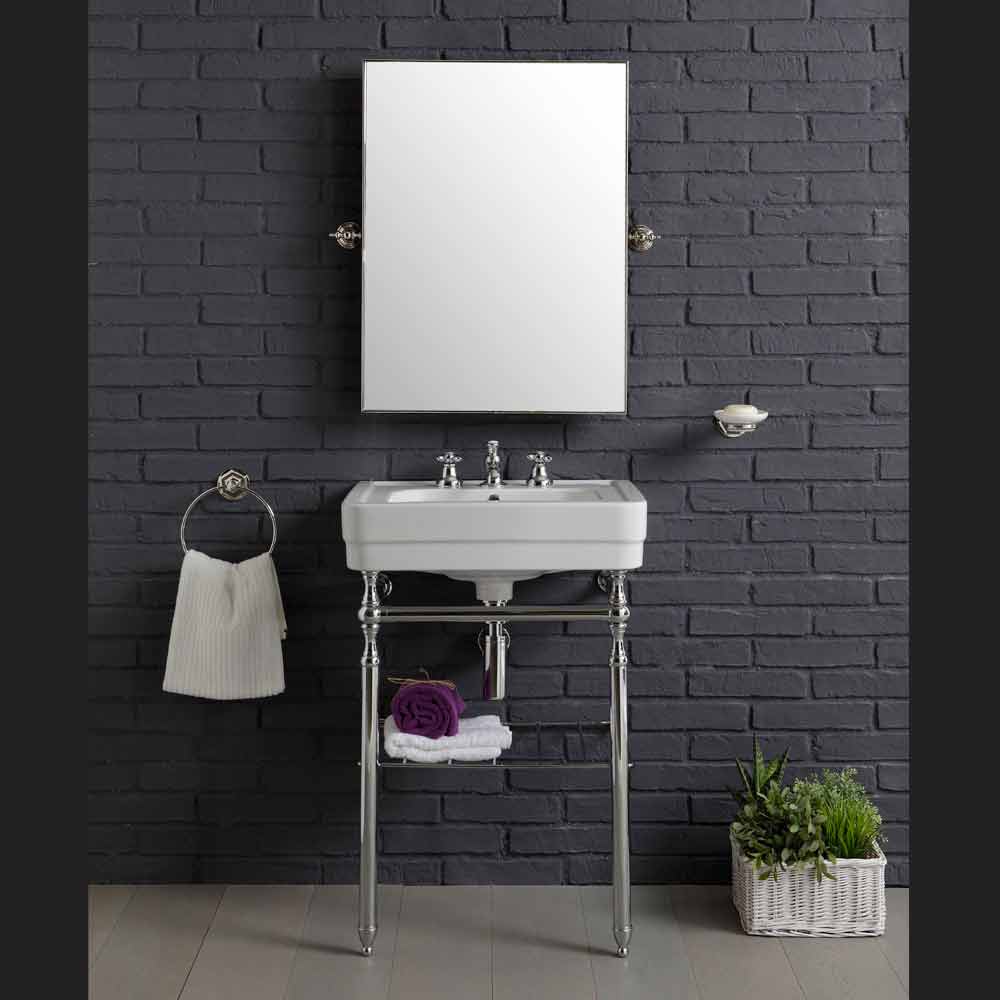 Parts included in the composition: - White ceramic washbasin. Measurements: L. 50 cm x D. 40.5 cm - Metal base complete with grille, in chromed finish L. 41 cm x H. 76 cm x wall protrusion 34 cm - Tap with drain - Siphon - Drain - Rectangular tilting mirror with chromed brass frame 76.5 cm x 57.5 cm. - Ring towel holder - Wall mounted ceramic soap holder