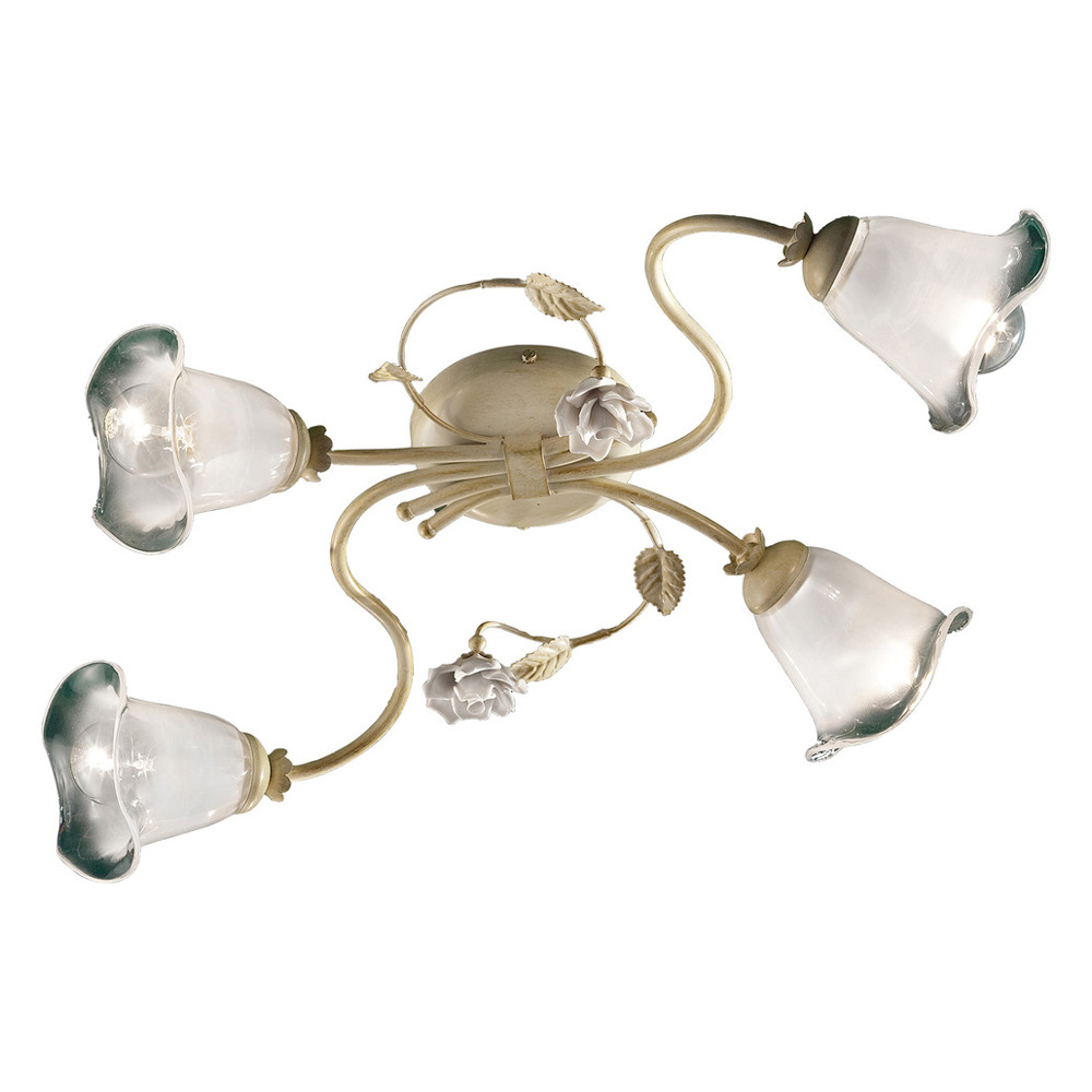 Round ceiling lamp with 3 or 4 lights in iron, glass and pink ceramic decoration made in Italy by Ferroluce.