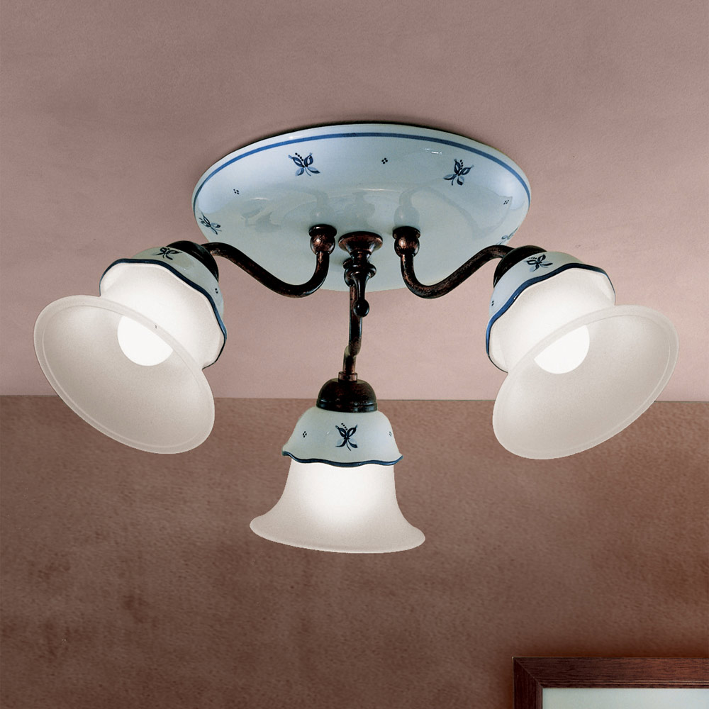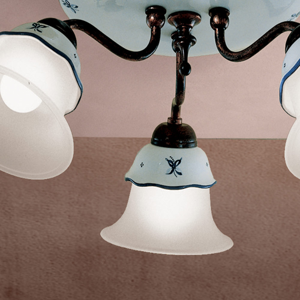 Ceiling lamp in iron, hand-decorated ceramic and acid-etched glass made in Italy by Ferroluce.