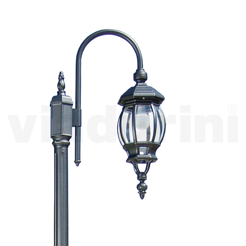 Garden lamp with structure made of die-cast aluminum with anthracite grey finish and transparent polycarbonate diffuser. Complete with stainless steel screws. A product that comes from a 100% Made in Italy production , characterized by a refined design and a vintage and romantic soul made unique by the wonderful details and the refined and refined decorations. Ideal for outdoor spaces such as gardens, avenues and walkways but also contract environments such as bars and restaurants.