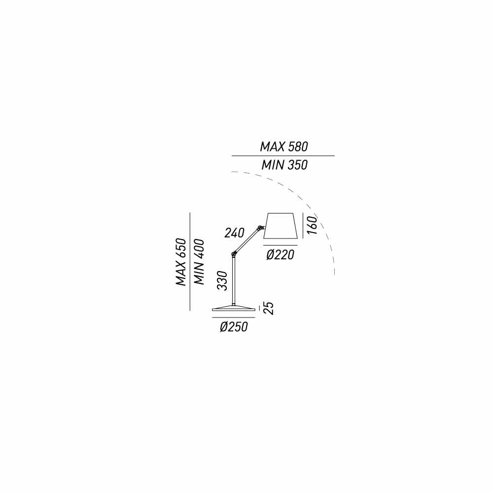 Measures Diffuser: Ø220 mm x h.160 mm; max lamp h.650 mm; Base Ø250 mm