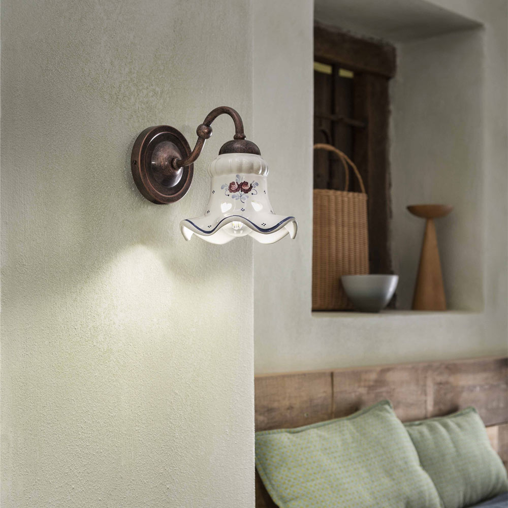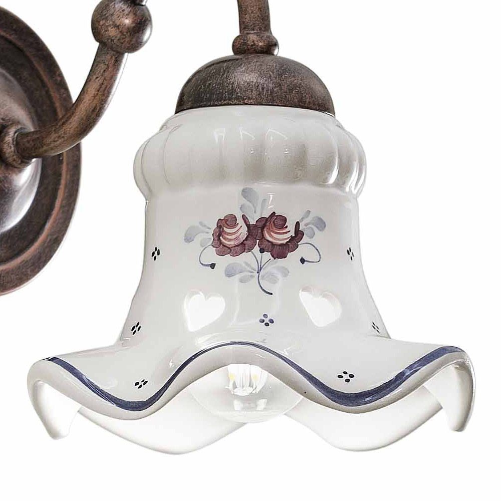 Hand-decorated iron and ceramic wall lamp, made in Italy by Ferroluce.
