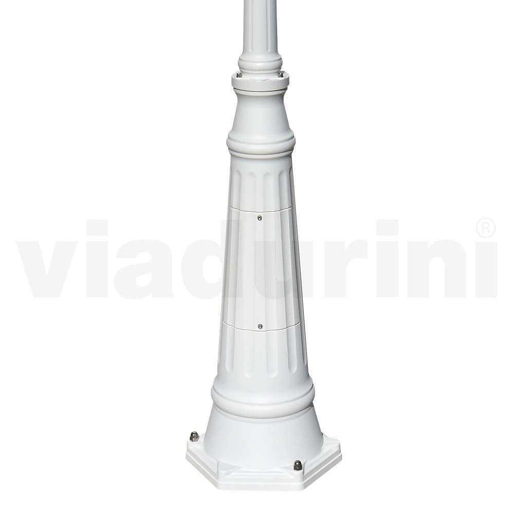 3-light garden lamp made in Italy with embossed white die-cast aluminum structure and natural brass diffuser (d. 260mm). Complete with stainless steel screws and silicone gasket for greater protection. From the perfect combination of functionality and elegance comes a unique furnishing accessory that ensures quality lighting and at the same time offers a decorative element with a traditional personality capable of completing the surrounding atmosphere thanks to its refined features and its imposing character. Ideal for outdoor environments such as gardens, courtyards, avenues and walkways but also contract spaces such as bars and restaurants.