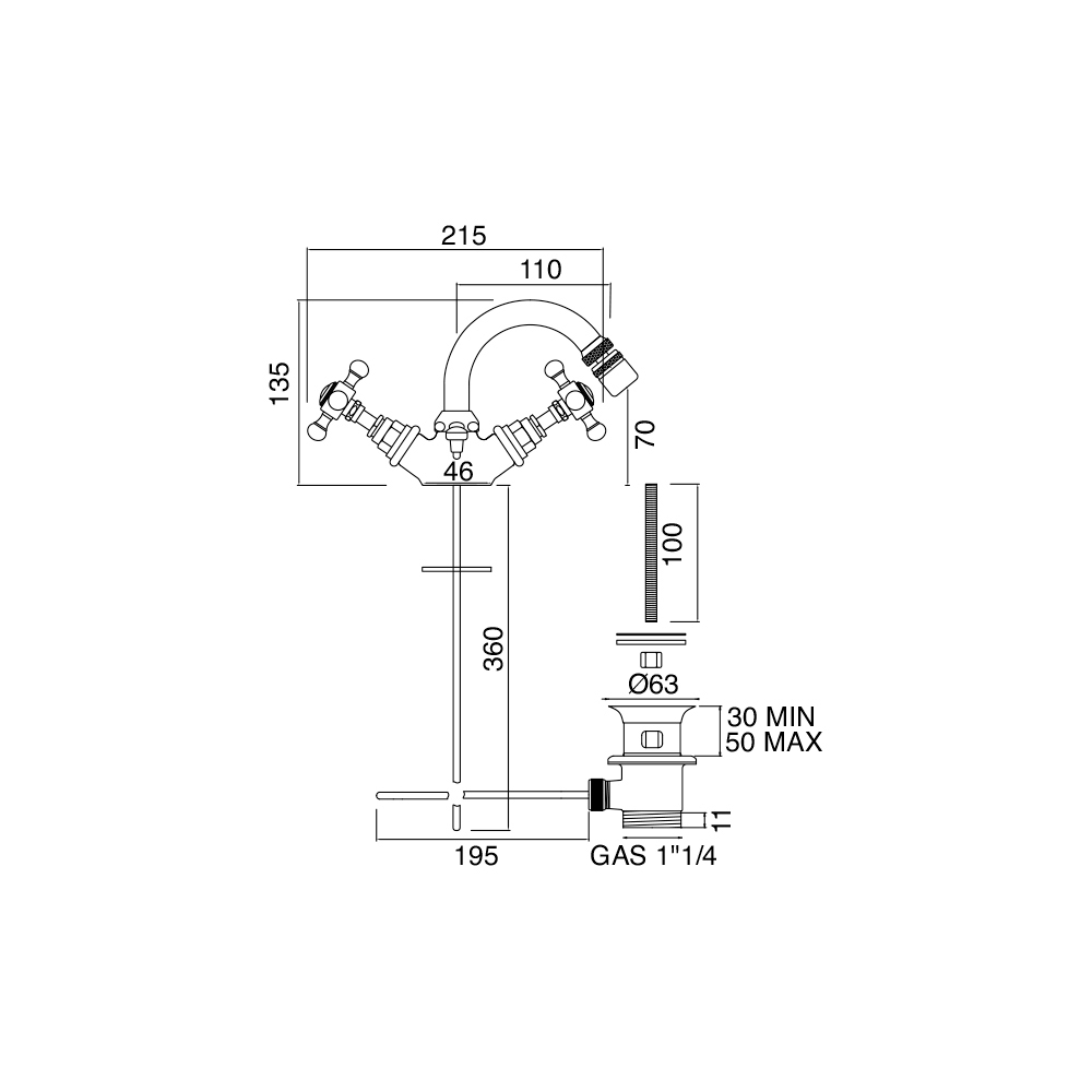 one-hole bidet mixerĀ with drain, made of brass.