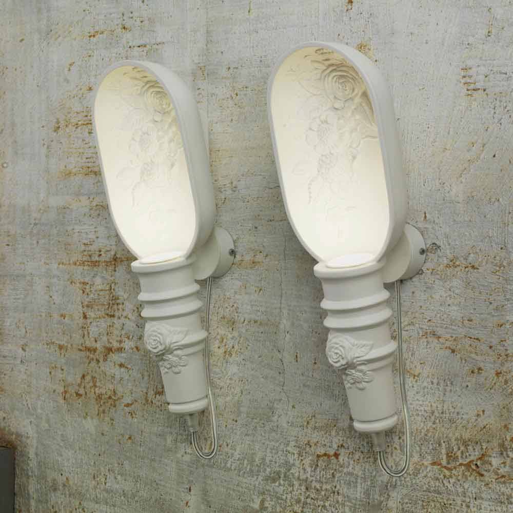 This original and unique wall light is characterized not only by its shapes, but also by its pure white color which is expressed in romantic floral decorations to fit into the most different spaces, bringing intimacy and refinement . The complement wants to highlight the authenticity and the thousand shades that characterise the personality of each one, through the representation of luminous elements with a unique and innovative design.