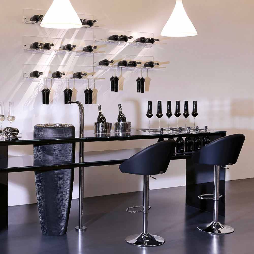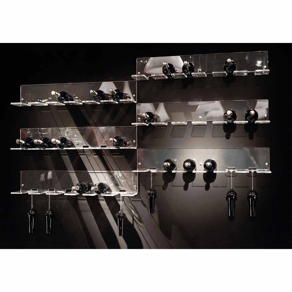 Wall-mounted bottle holder made entirely in Italy in transparent plexiglass that allows you to store and organise up to 6 bottles or 6 wine glasses. A furnishing solution that, in addition to offering a practical and functional idea for arranging your own bottles of wine in a structured way, also responds to the needs of those looking for a product that can optimise space thanks to a minimum footprint. . The material used and the chosen finish also make it an extremely versatile product capable of adapting to every stylistic situation, both domestic and contract, bringing with it a modern and innovative touch . The 100% Made in Italy workmanship and the use of quality raw materials give life to a solid and robust bottle holder , ideal for those who love to furnish their rooms with personality without neglecting the fundamental functional aspect of the product for an optimal result .