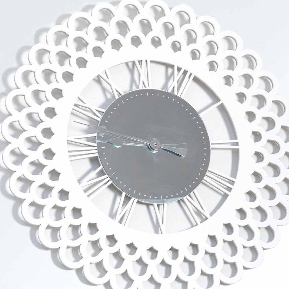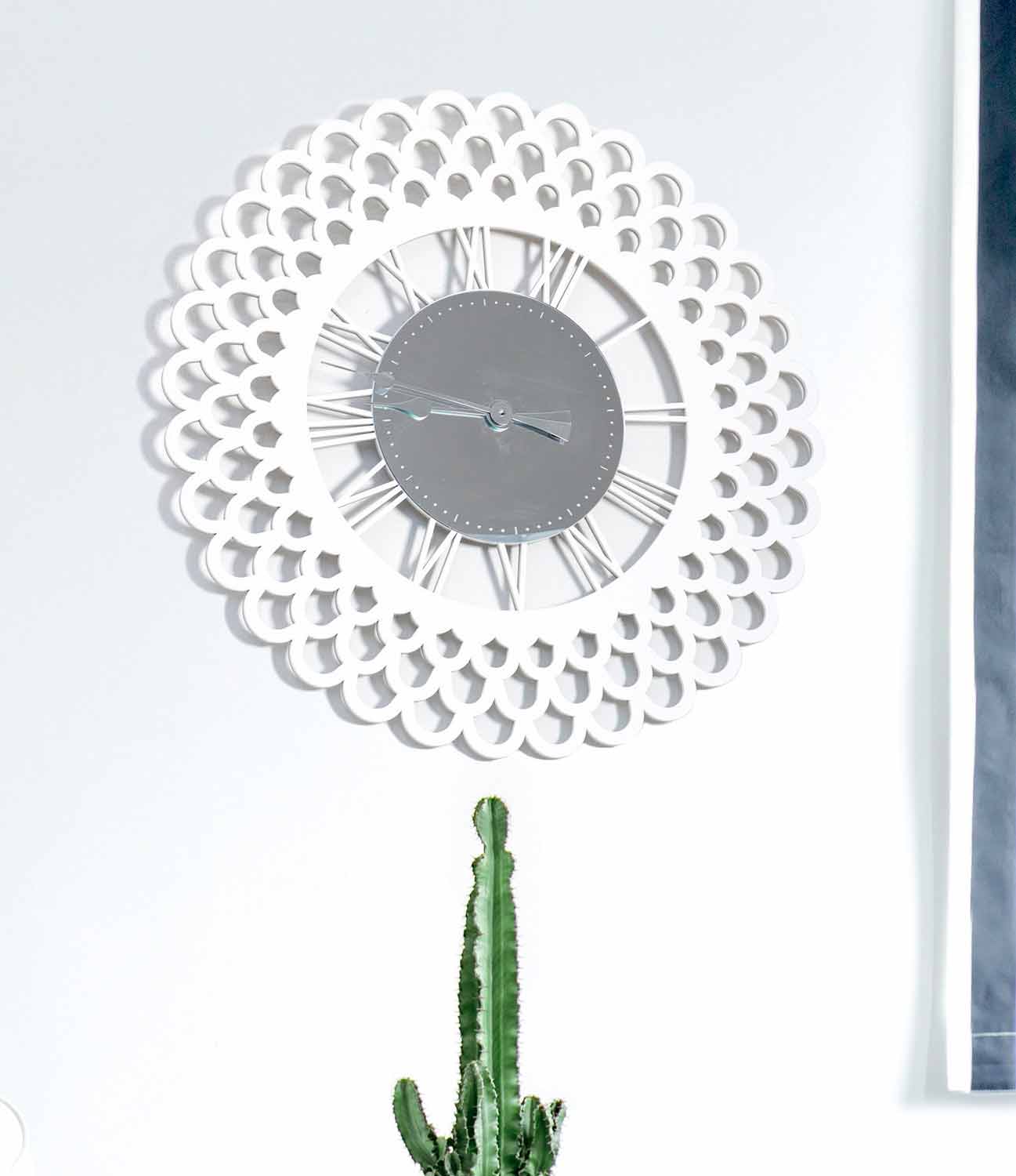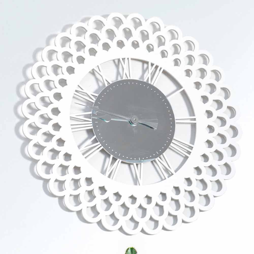 A particular wall clock , made of laser-cut white wood , whose shape resembles that of a flower that has just blossomed.